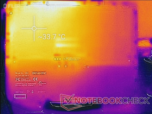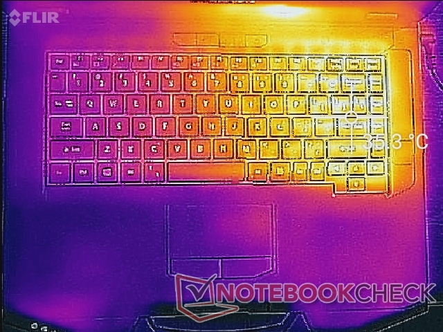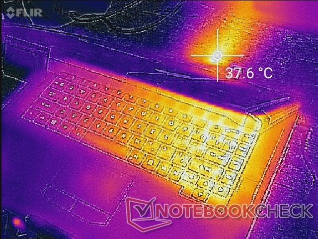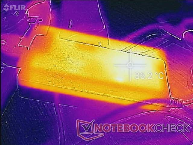 Surface temperatures are not an issue since the chassis is much thicker than most laptops with the same CPU. Hot spots can range from just 35 C to 38 C. The right half of the system will always be warmer than the left half because of how the cooling solution is positioned inside.