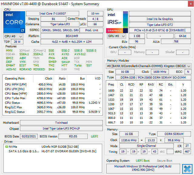 v (old) | 04 / 2021 | Durabook S14I i7-1165G7, Iris Xe G7 96EUs | 3 kg | 38.1 mm | 14.00" | 1920x1080 | |