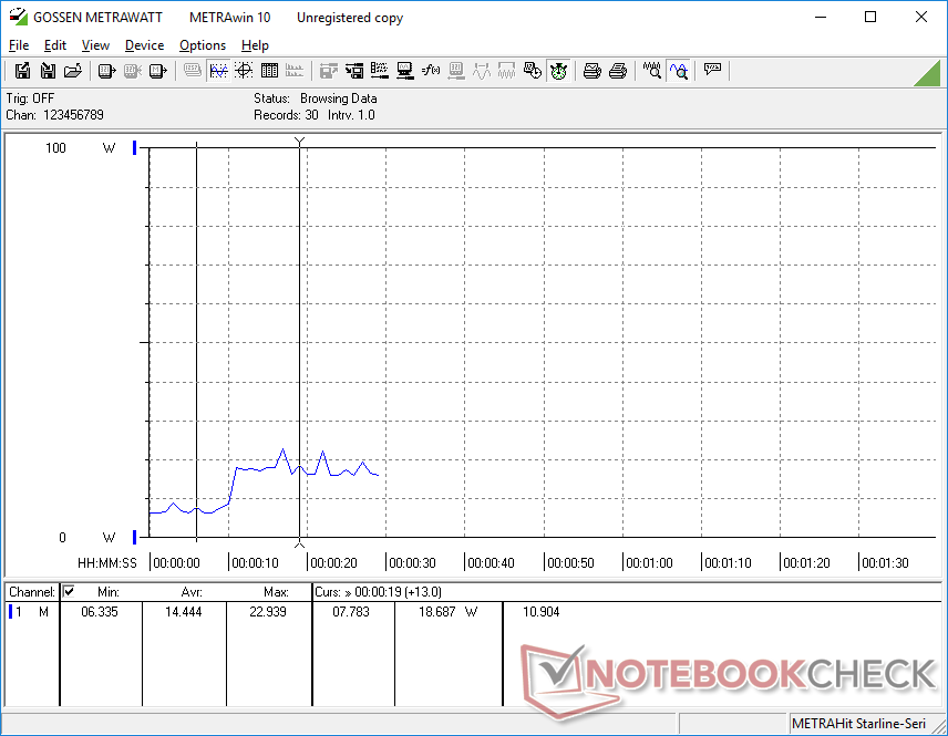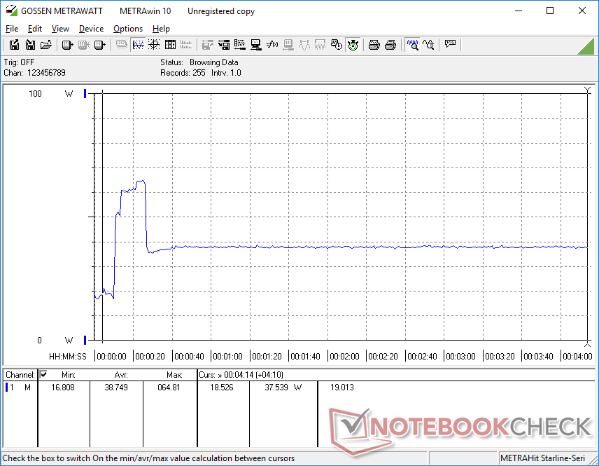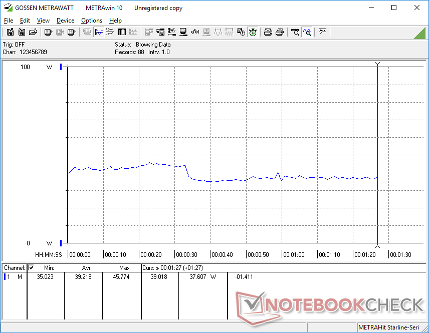 Idling on desktop consumes between 6 W and 17 W to be more than most other Core U-series-powered Ultrabooks due to the extra-bright display on the Durabook. Higher loads like 3DMark will demand about 39 W.