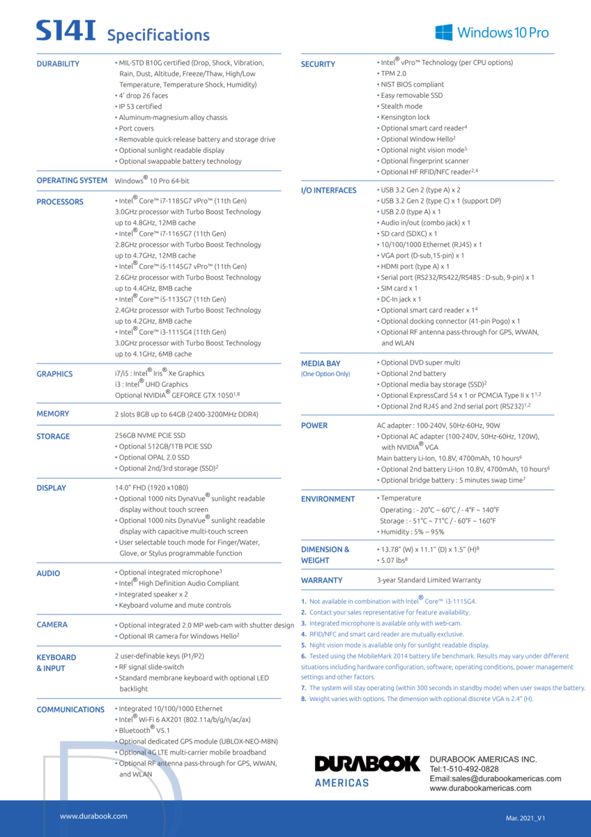 Announced in March, the Durabook S14I is notable for being one of the first rugged laptops to ship with 11th gen Intel Tiger Lake-U options and other features commonly found on consumer Ultrabooks like Wi-Fi 6, NVMe SSD support, and optional vPro. There are plenty of configurations available as detailed by the official specifications sheet below.