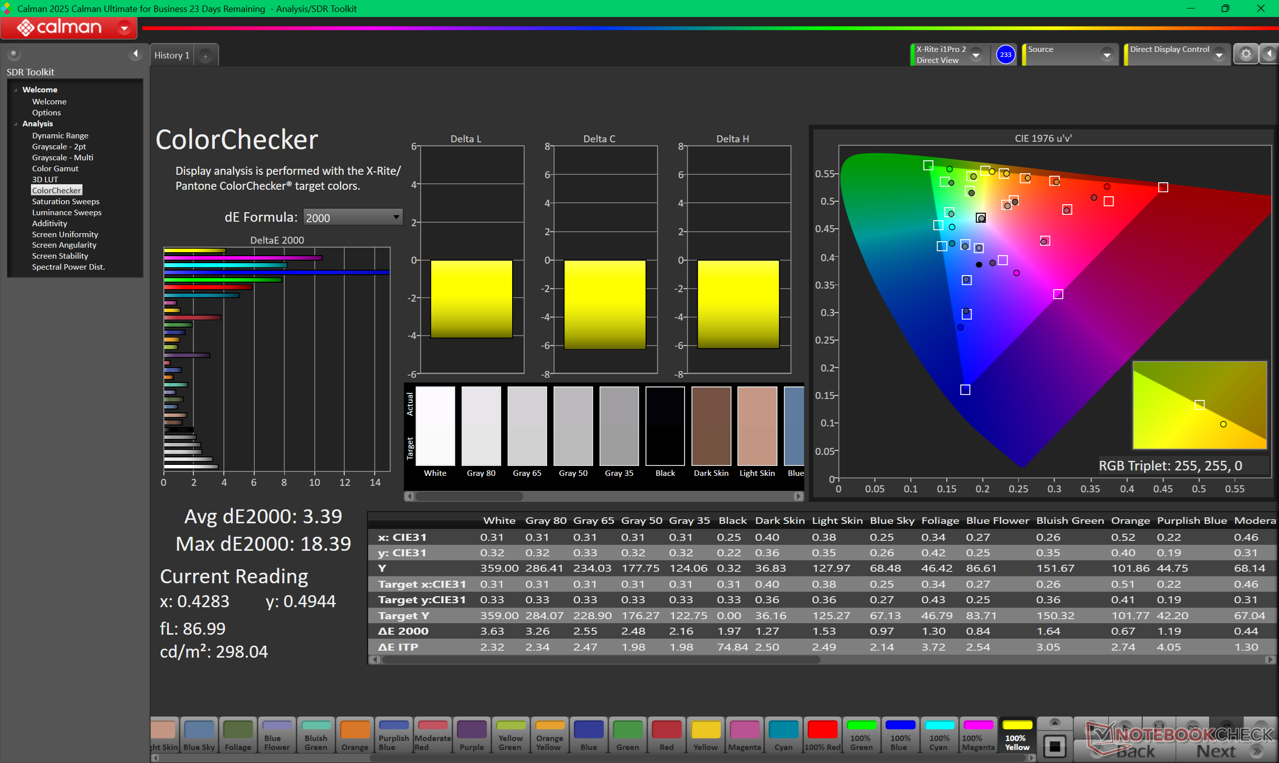 Color temperature is slightly too warm at ~6100K out of the box. Calibrating with an X-Rite colorimeter addresses this concern and improves average DeltaE values as shown by the CalMan screenshots below. Owners can download and apply our free calibrated ICM profile above.