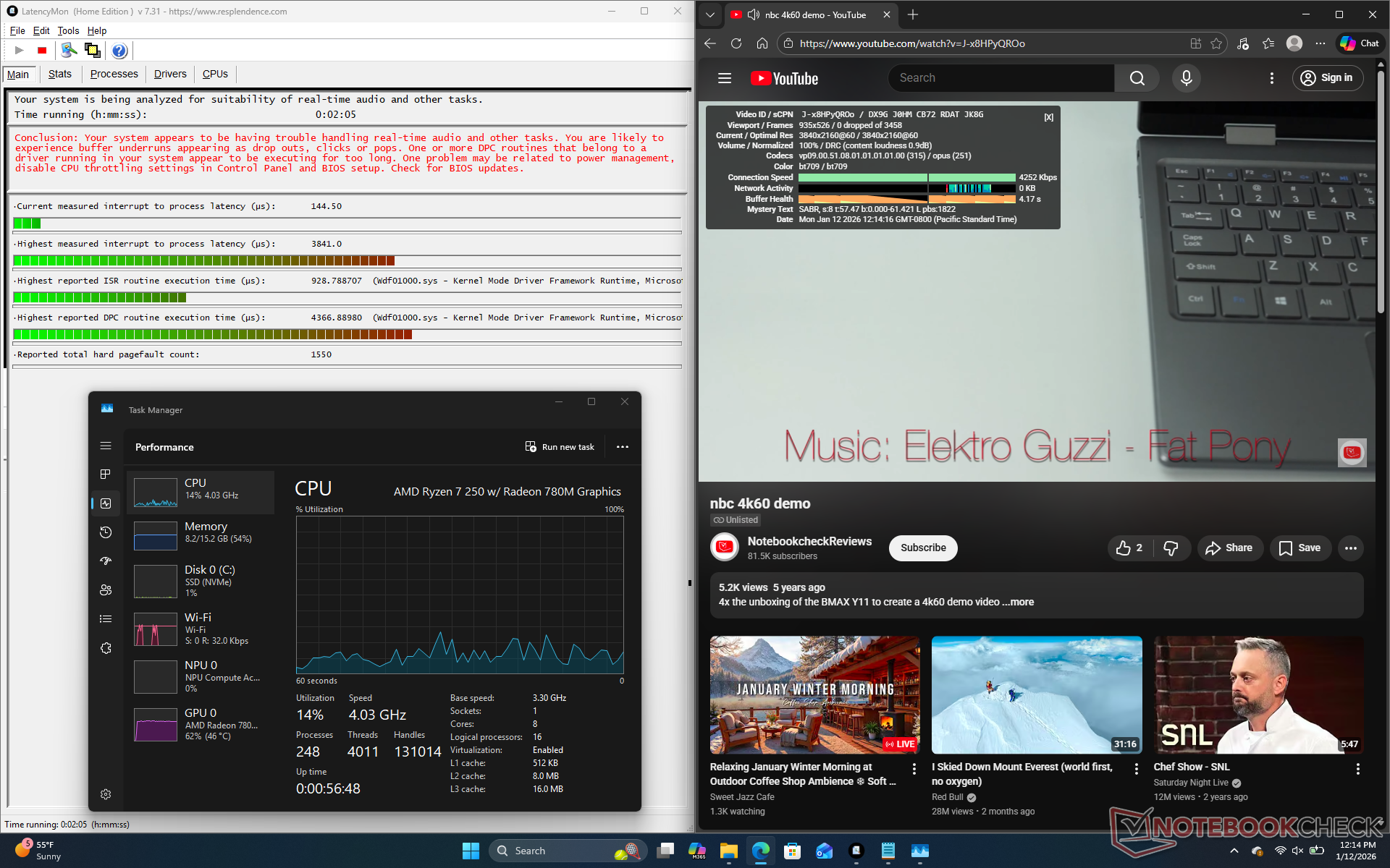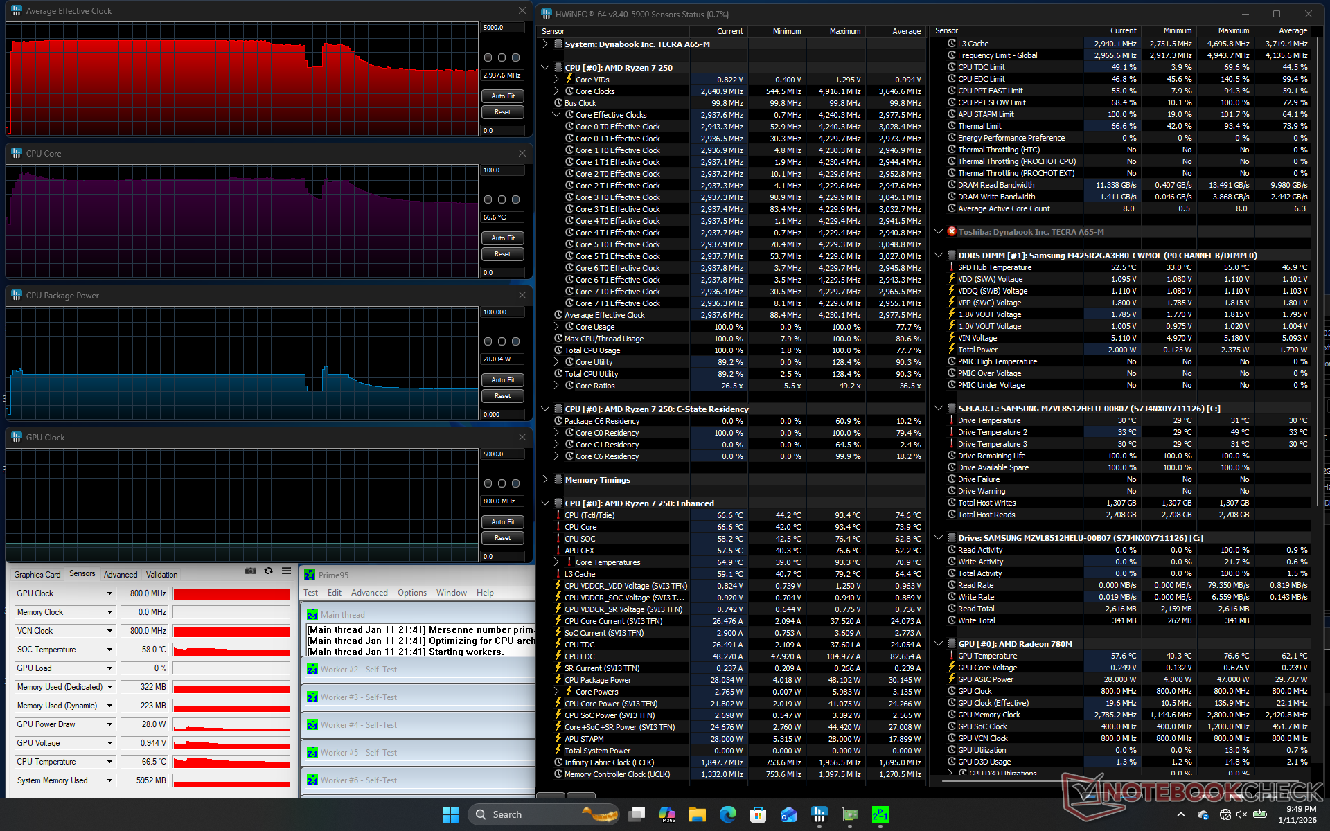 The CPU would boost to 4.2 GHz, 41 W, and 87 C for the first couple of minutes before falling and stabilizing at 3 GHz, 28 W, and 67 C. The processor would remain relatively cool at under 70 C compared to 75 C on the Intel-powered Asus ExpertBook B5.
