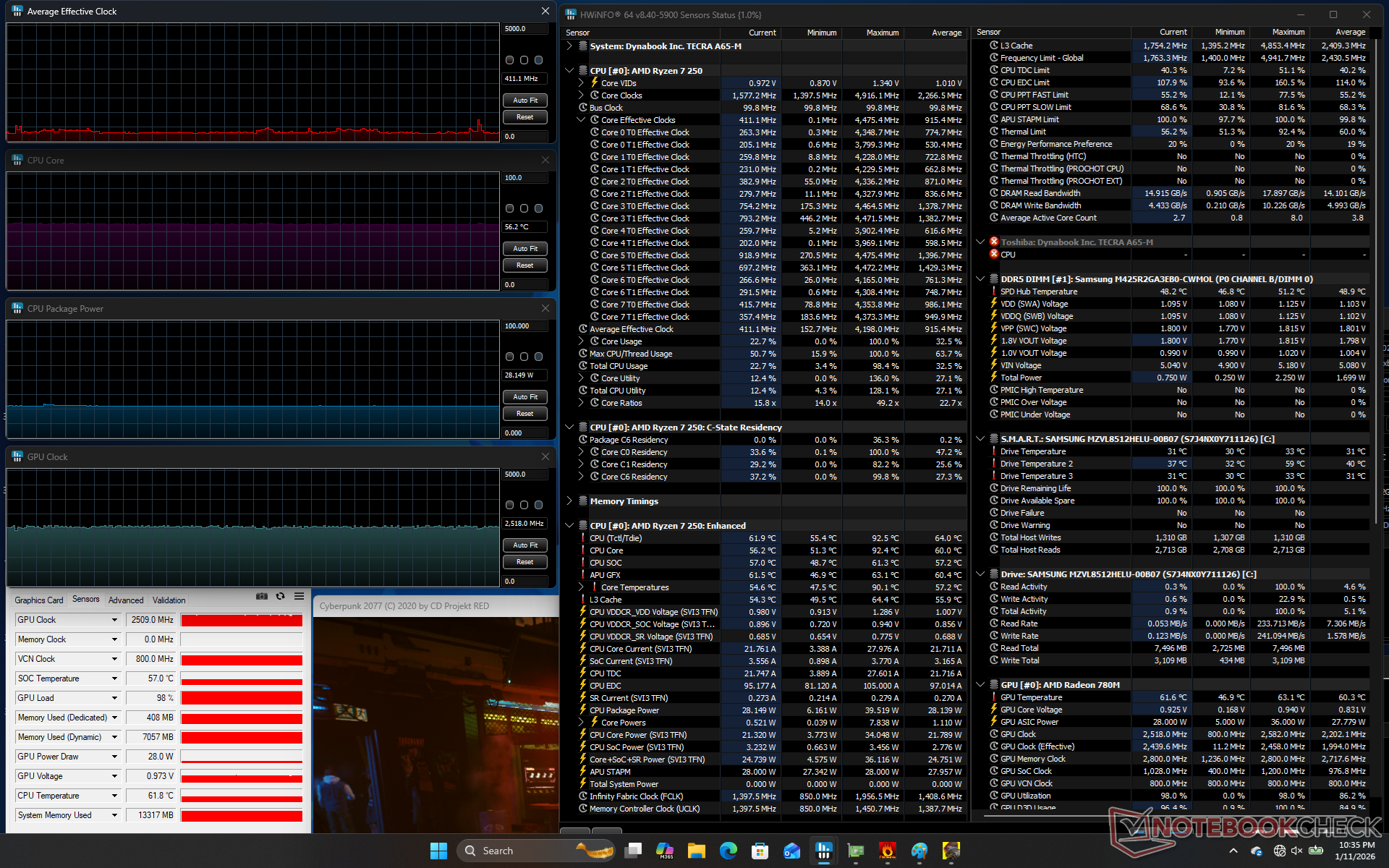 The most disappointing aspects of the Tecra A65-M are arguably its narrow color reproduction and weak GPU and AI performance. The limited colors are understandable to preserve affordable starting prices, but there should at least be a second panel option with full sRGB colors for those who require it. As for the CPU, sticking with Zen 4 allows the model to preserve as much raw performance as possible without resorting to the more expensive Zen 5 series, but its aging integrated GPU and limited AI acceleration make the system less-than-ideal when for running more advanced tasks involving Co-Pilot+ or graphics editing software.