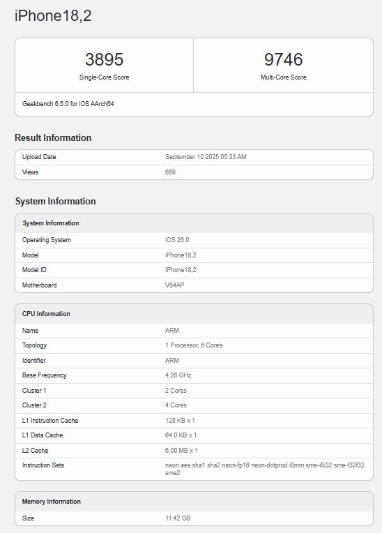 As spotted on Geekbench, the Apple A19 Pro on the iPhone 17 Pro Max earns a single-core score of 3,895 and a multi-core score of 9,746. The A18 Pro on last year's iPhone 16 Pro Max scored 3,479 and 8,568 on those same tests, indicating around a 10% upgrade in CPU performance for the new chipset.