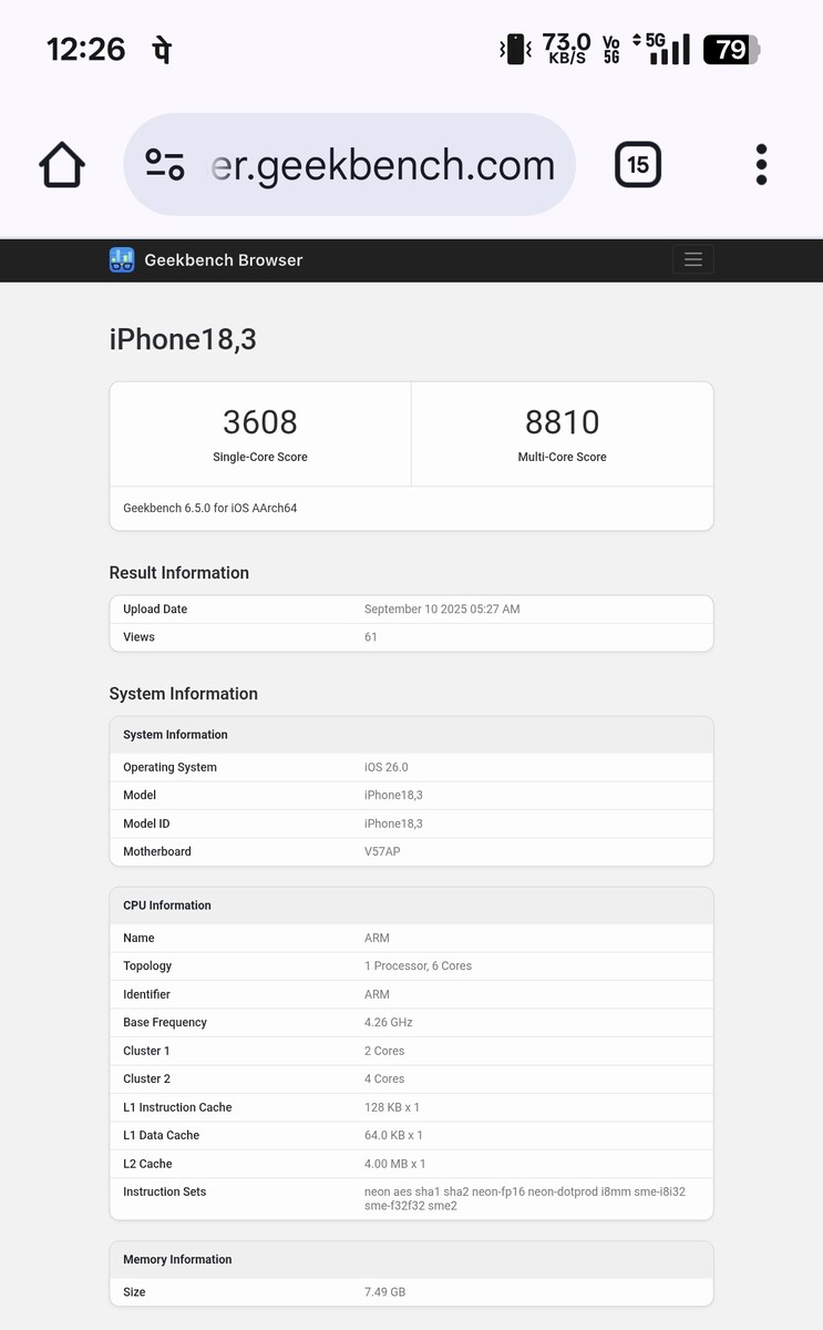 The standard iPhone 17 comes equipped with the A19 rather than the A19 Pro on its siblings. Last year's A18 was only slightly worse than the A18 Pro on the CPU side, and that appears to be the case this time out as well. The vanilla iPhone 17 scores 3,608 on the single-core test and 8,810 on the multi-core one. Compared to the iPhone 16 which scored 3,377 and 8,362 in our tests, the A19 and iPhone 17 look to be about 7% more powerful.