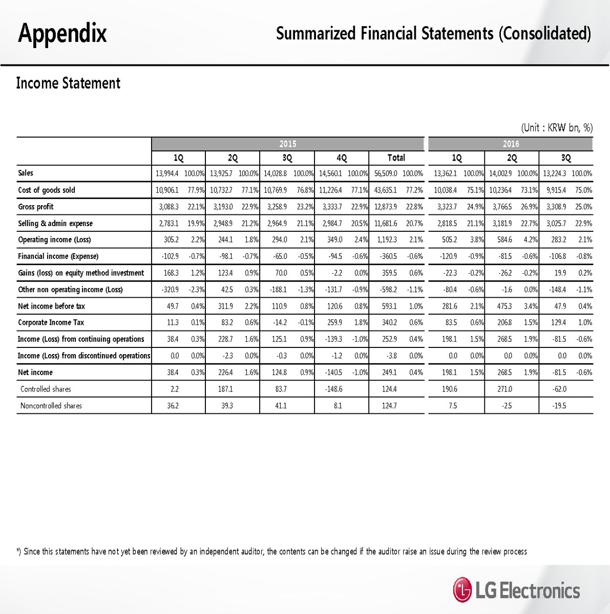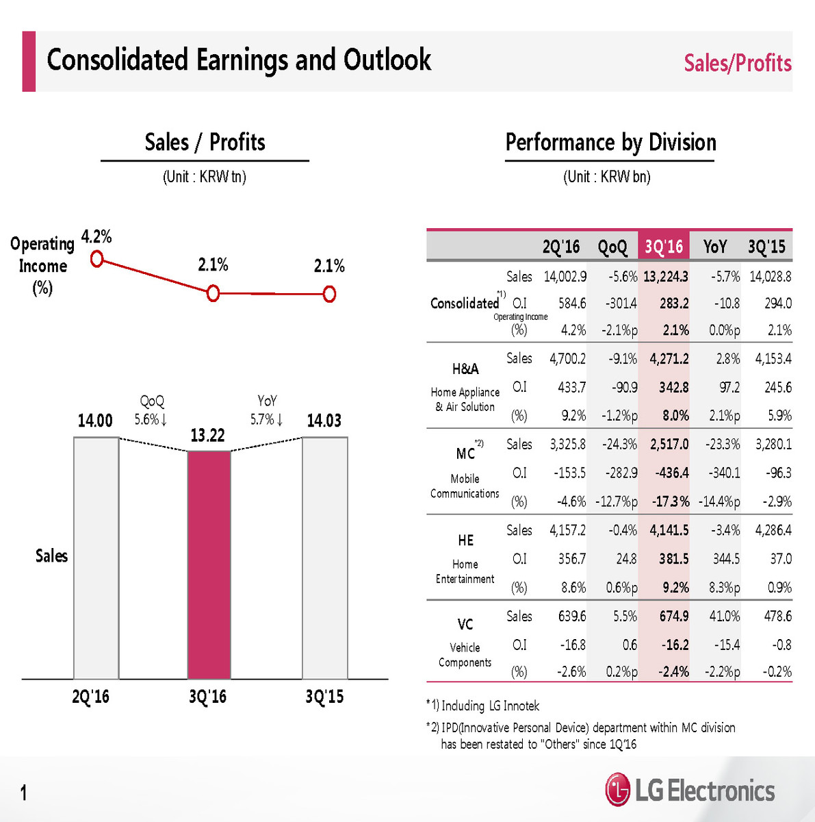 LG Electronics reported a record quarterly loss for its mobile division. Sales from its mobile phone business were down 23 percent in the third quarter to KRW 2.52 trillion (USD 2.3 billion). Total smartphone shipments of LG fell 9 percent compared to the same time last year. "Lower sales of premium devices and expenses related to business structure improvement activities" resulted in a quarterly operating loss of KRW 436.4 billion in LG's mobile divsion.
