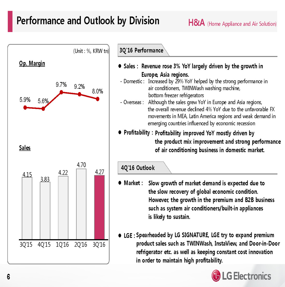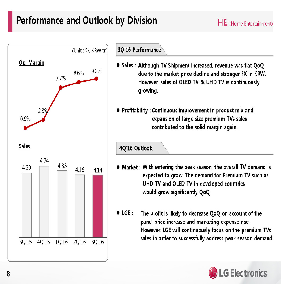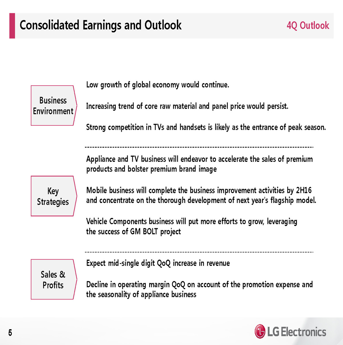 LG expects only a small sequential growth in Q4 revenue. Operating margins will be under pressure from seasonal promotions. LG Electronics expects to complete the restructuring of the mobile business by year-end and then focus fully on coming up with a better flagship model for next year. LG will focus on growing sales of its new V20 smartphone, as well as expanding in the mid tier smartphone market.