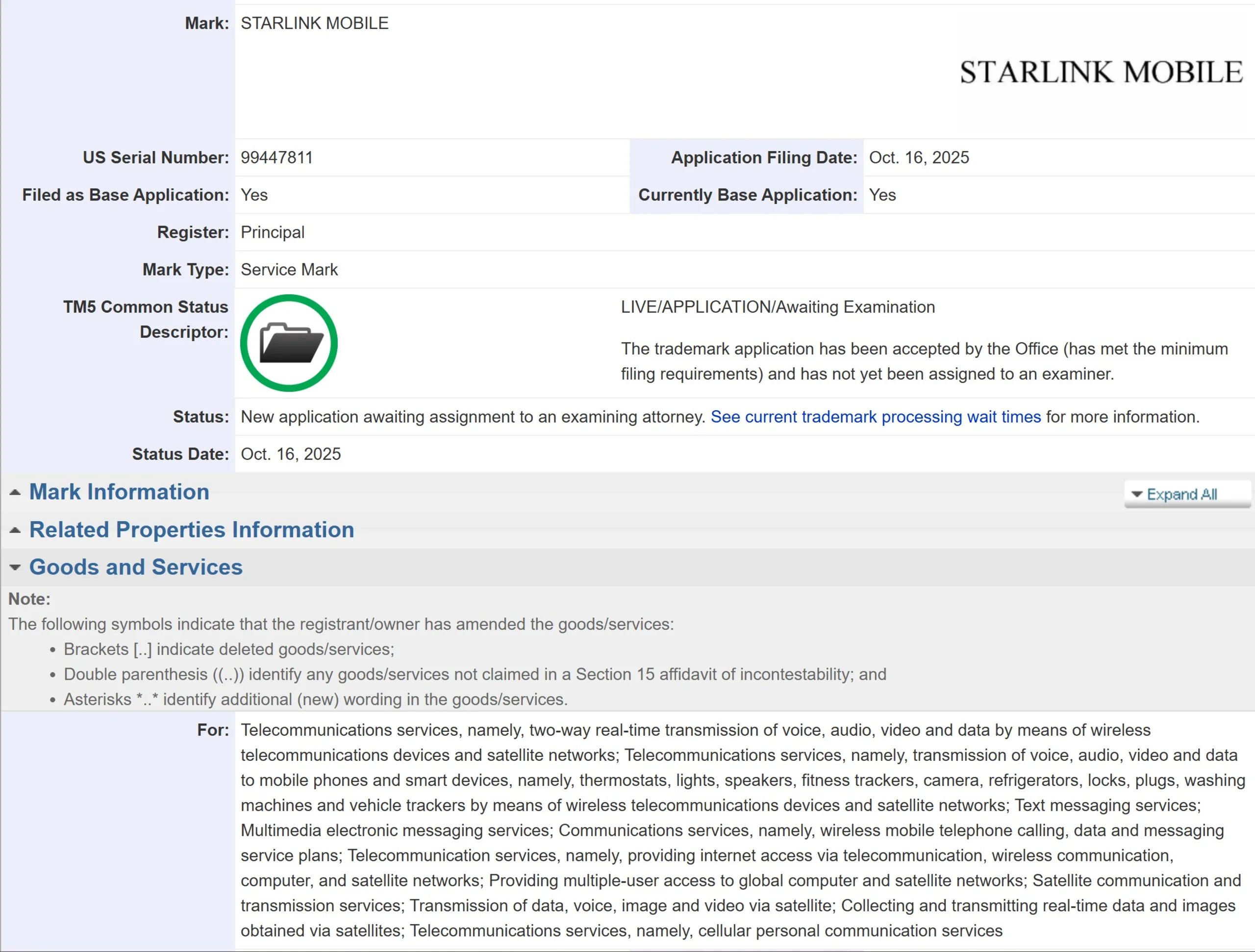 To bring this vision to reality, SpaceX has now filed for the name of the undertaking, trademarking Starlink Mobile at the USPTO, and the scope of the new brand's services sounds suspiciously like the birth of a new cell phone carrier, just beaming voice and data from space, rather than from terrestrial cell towers: