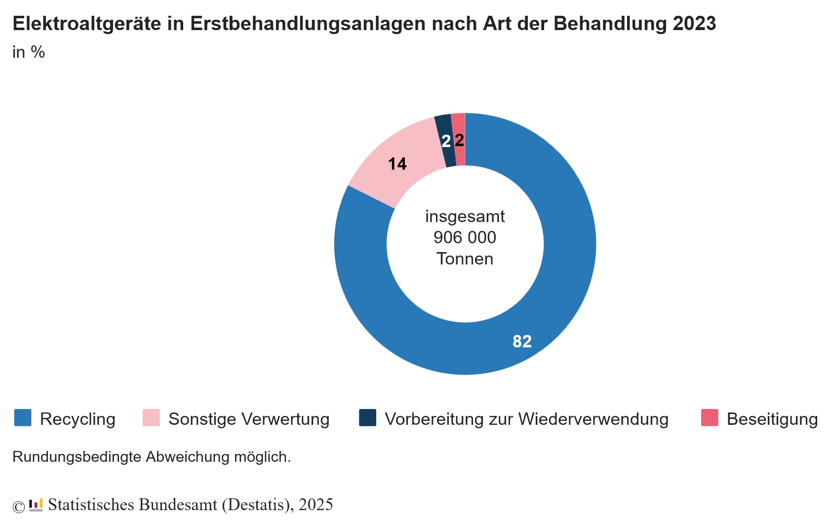 The recycling of electronic waste in Germany remains a highly important issue for the raw materials transition. According to the German Federal Statistical Office (Destatis), 906,100 tons of e-waste was processed at certified primary treatment facilities in 2023. Of this, 747,000 tons were recycled, corresponding to a recycling rate of 82.4%.