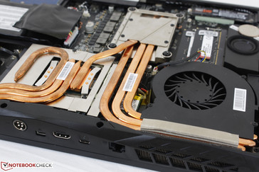 The bottom panel pops off without much effort to reveal core upgradeable components. The arrangement of the heat pipes in the Killer Edition has changed slightly from the GTX 1070-equipped Tornado F5. The physically larger LGA 1151 socket can also be observed on both Eurocom systems compared to the soldered HQ solution on the GT62VR. The M.2 WLAN card is hidden underneath the heat pipes and access to the last two SODIMM slots will require additional disassembly.