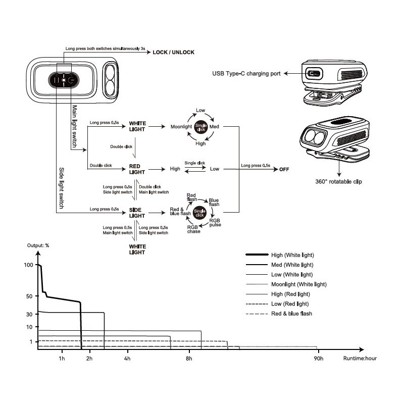 Controls and runtimes of the E04R flashlight