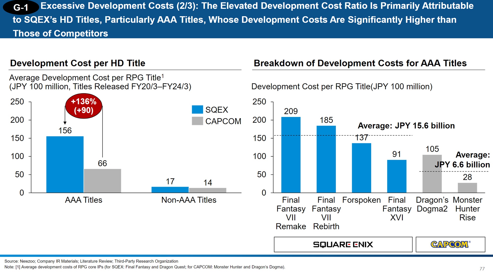 3D Investment Partners published a series of slides detailing the company’s alleged wasteful spending. Along with other shareholders, the firm wishes to “engage in constructive dialogue with SQEX HD to enhance its corporate value.” According to the report, many Square Enix games were too expensive to produce relative to the revenue they generated.