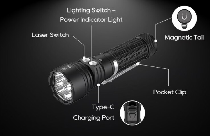 At first glance, the TerraBeast M5 appears to be a rather unremarkable flashlight with a black aluminum housing with an IP66 certification, which means that it can be dropped into water without taking damage. However, a more or less unusual feature is the integrated laser.