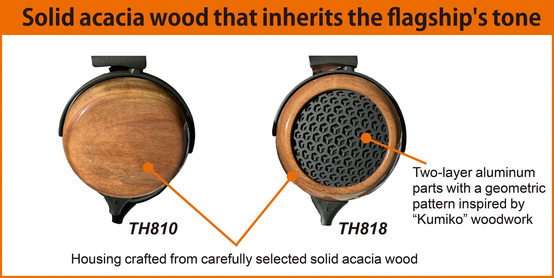 Fostex has announced the upcoming TH810 closed-back and TH818 open-back premium over-ear headphones. Both utilize the same components as the previously announced flagship TH910 and TH919 headphones, but use more affordable acacia wood housings rather than Japanese-lacquered maple housings decorated with sulfur-smoked silver foil patterning.