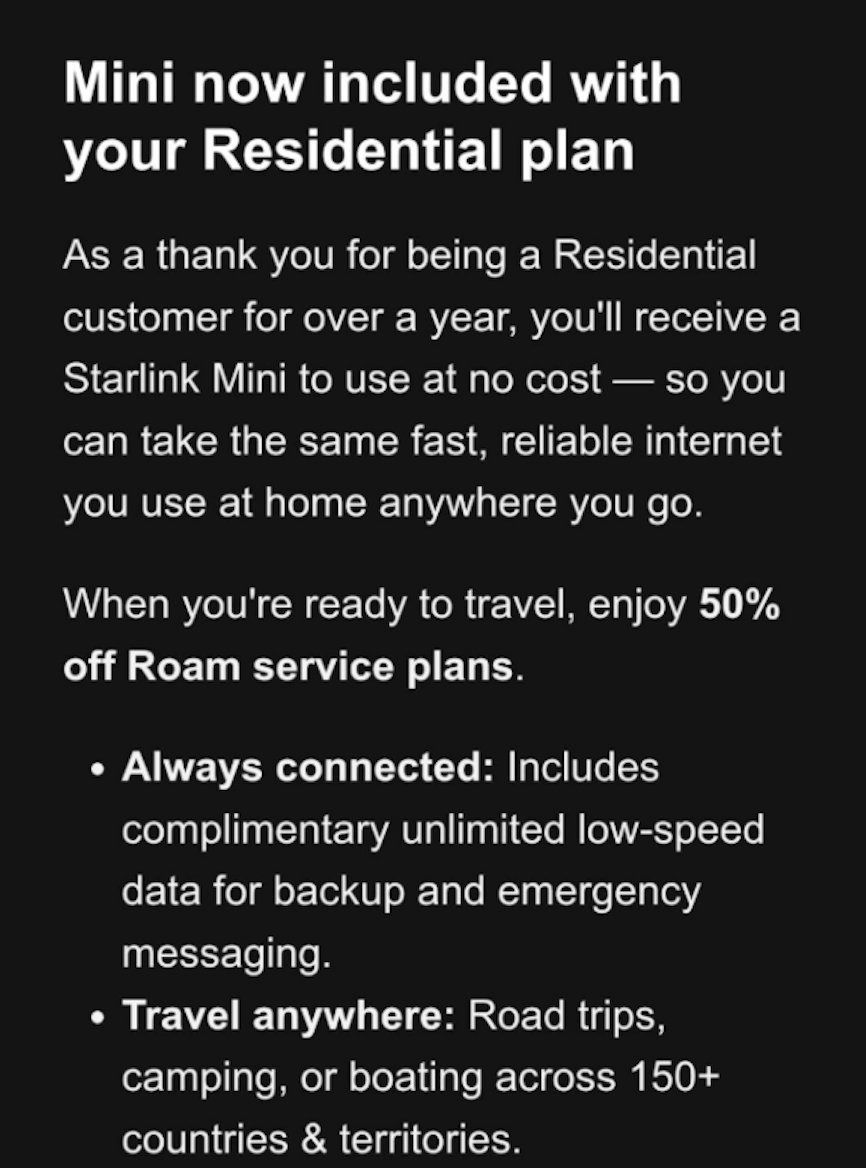 Customers who have been with its Residential plan for over a year are now getting the message that they are entitled to a free Starlink Mini dish, which, while a US$390 value, would prompt them to also subscribe for the Roam plan ensuring an extra stream of income for Starlink from the same customer.