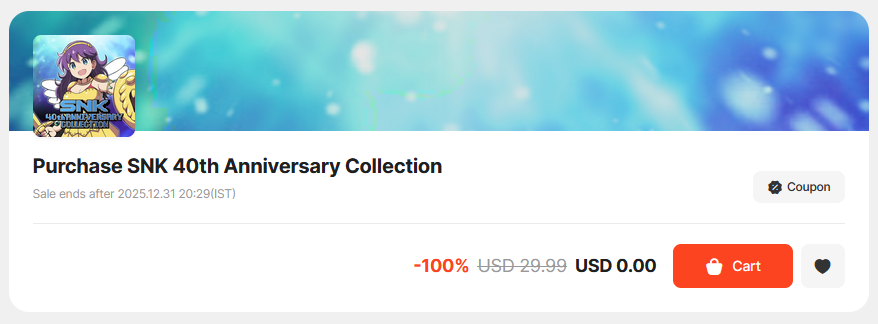 SNK’s retro arcade bundle has just gone free on the Stove store. PC players can now grab a collection of 24 classic titles from the company’s early years without paying anything. The SNK 40th Anniversary Collection normally sells for $29.99, and is now listed at $0.00 with a full 100% discount for a limited time.