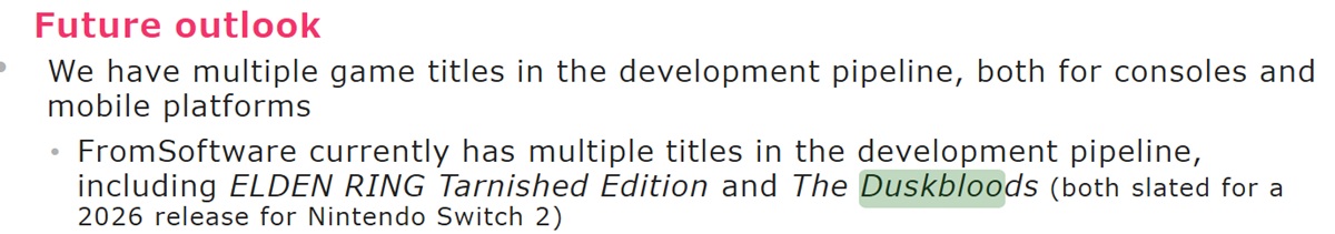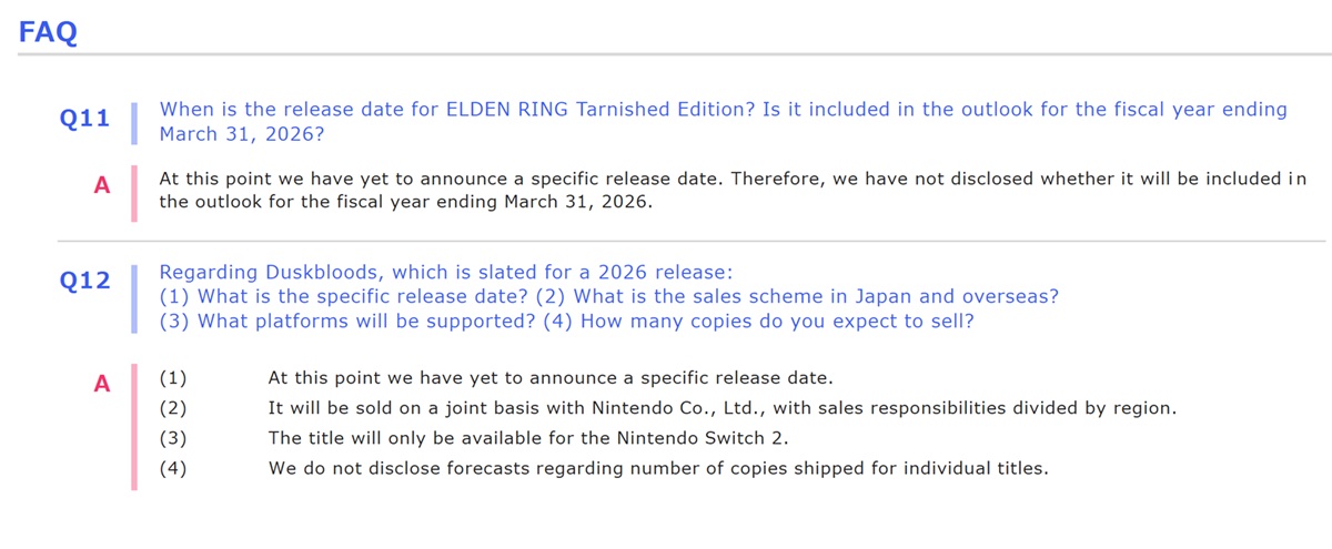 Kadokawa included an update in its Q3 Fiscal Year 2026 report. When discussing declining operating profits compared to the previous year, it referenced the Switch 2 games. The Duskbloods and Elden Ring Tarnished Edition are “both slated for 2026 release.”