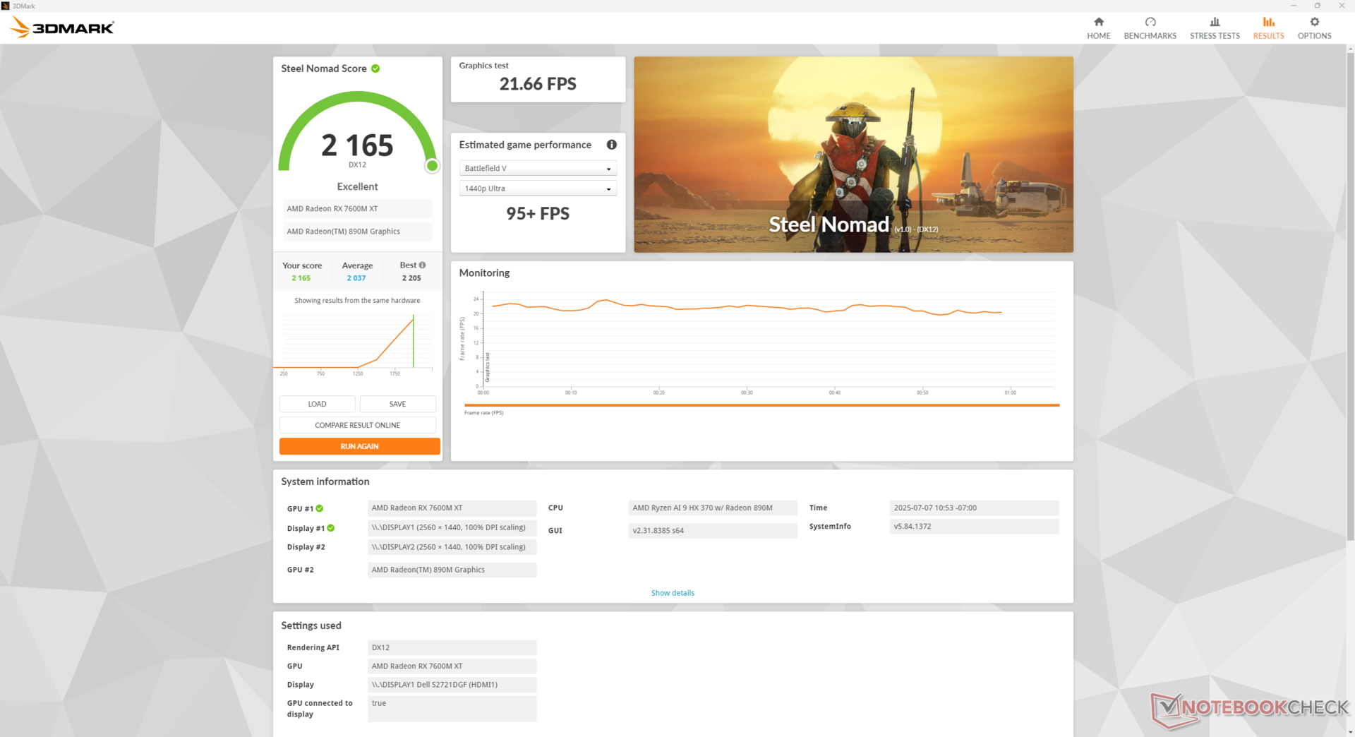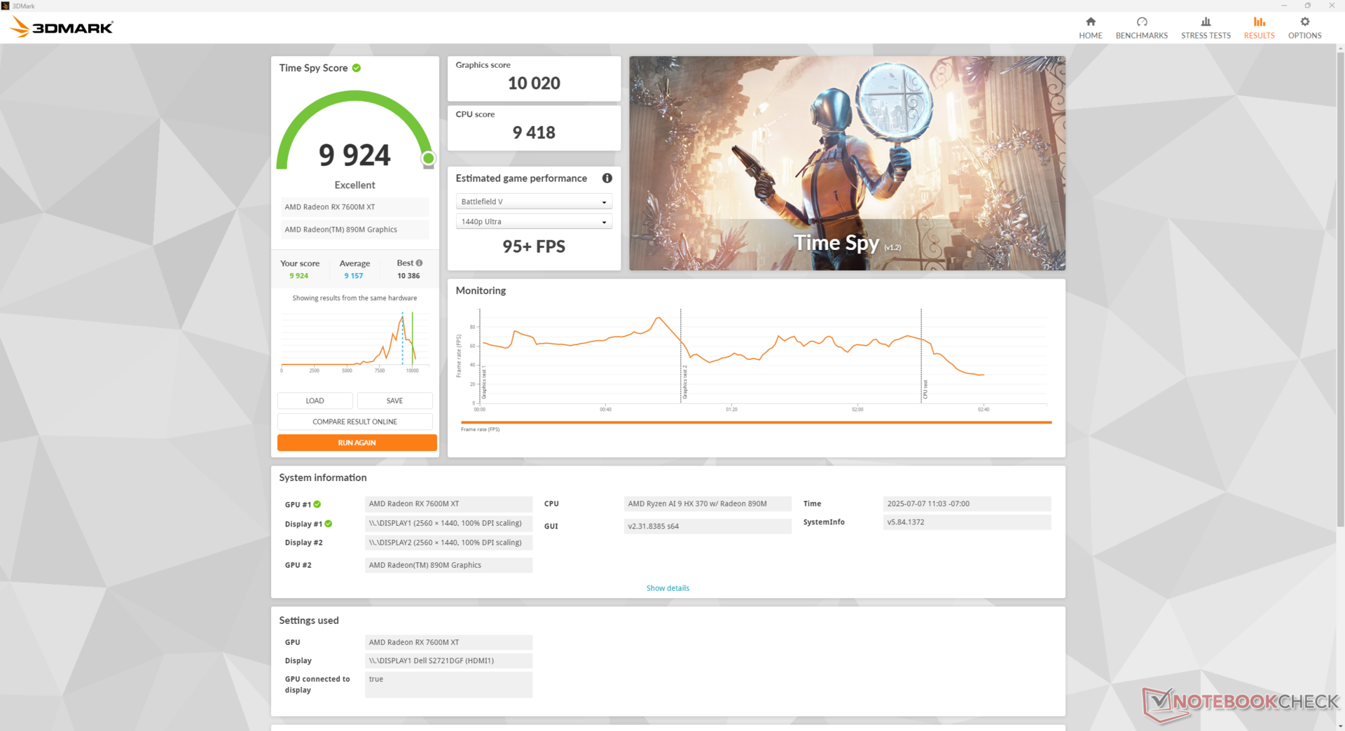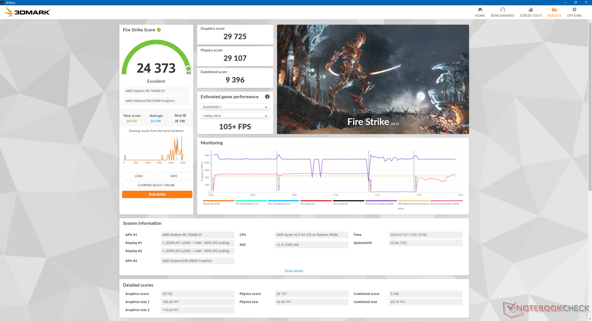 Raw performance sits in between the GeForce RTX 4050 and RTX 4060. If running more demanding DX12 titles with ray-tracing, however, the Radeon RX 7600M XT falls behind significantly due to its weak RT cores when compared to Nvidia. This is exemplified by our very low score in the RT-specific Port Royal benchmark.