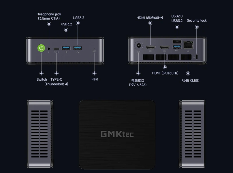 The Ryzen 9 7940HS gives the GMK K4 an octa-core CPU that can boost to 5.2 GHz and a Radeon 780M iGPU. For reference, AMD builds the APU on a 4 nm process and allows it to scale between 35-54 W when needed. By default, GMK sells the mini-PC as a barebones unit, with twin SO-DIMM slots (DDR5-5600) and an M.2 2280 slot for PCIe 4.0 SSDs. Alternatively, the company sells pre-configured models with 1 TB of storage and 16 GB or 32 GB of RAM. Moreover, the GMK K4 has the following ports: