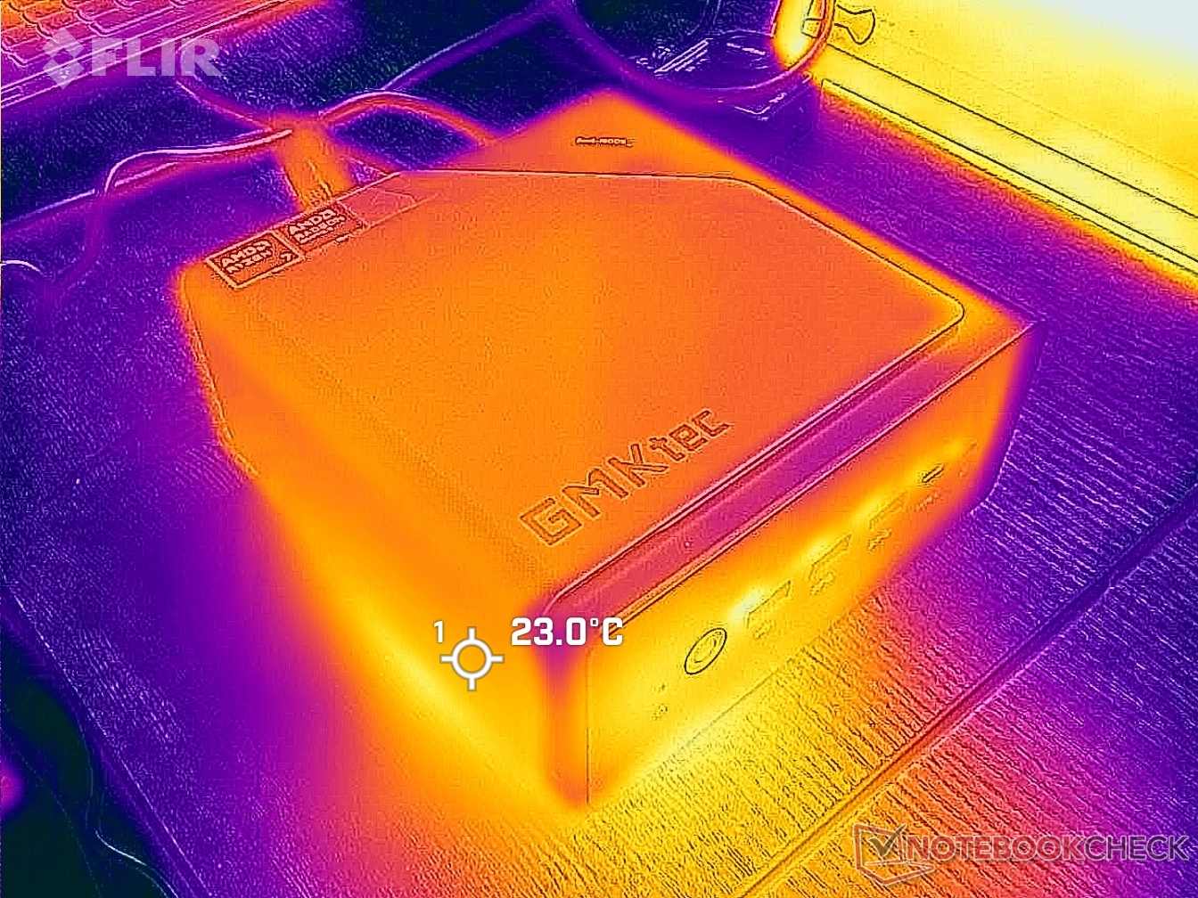 The cooling solution consists of two fans and a vapor chamber cooler. Fan noise is nonetheless on the loud side at 35 dB(A) against a silent background of 24 dB(A) even when idling on desktop. Noise levels top out at the low 40 dB(A) range when higher loads are introduced to be average for a mini PC.