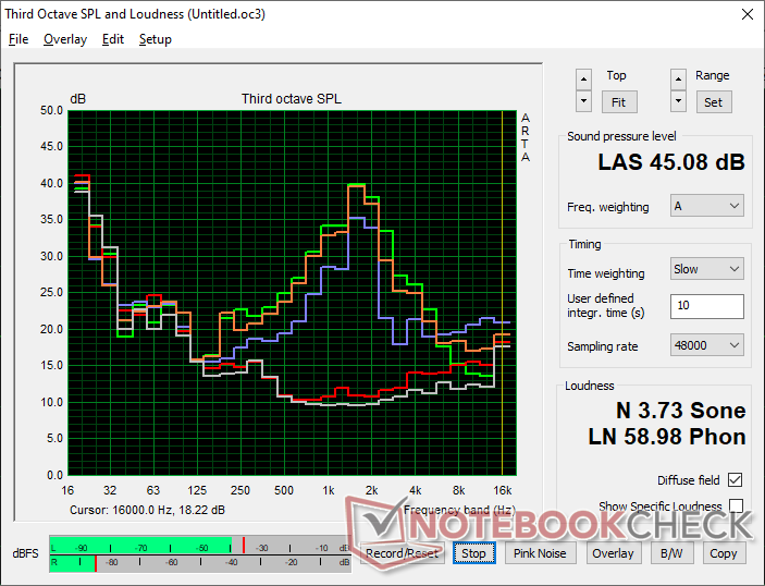 Fan noise is a mixed bag. While the system is generally quiet when web browsing or running other undemanding loads, fan noise would pick up rather quickly to over 40 dB(A) when running more intense applications such as games. Furthermore, the fan is high-pitched as shown by our sharp graph below which means any RPM changes will be more noticeable to the ears.