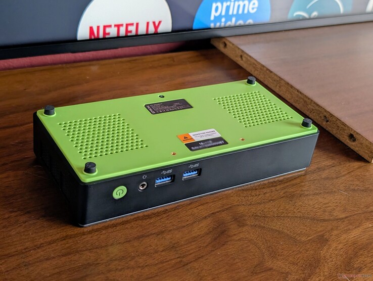 The firm chassis consists of dark gray metal but with a plastic green bottom to match the color tone of the GMKtec logo. Its most striking feature is arguably the small size and narrow dimensions when compared to the squarer designs of most other mini PCs including those from the same manufacturer. The model is also nearly 25 percent lighter than the MSI Cubi NUC which carries similar Intel Lunar Lake-V processor options.