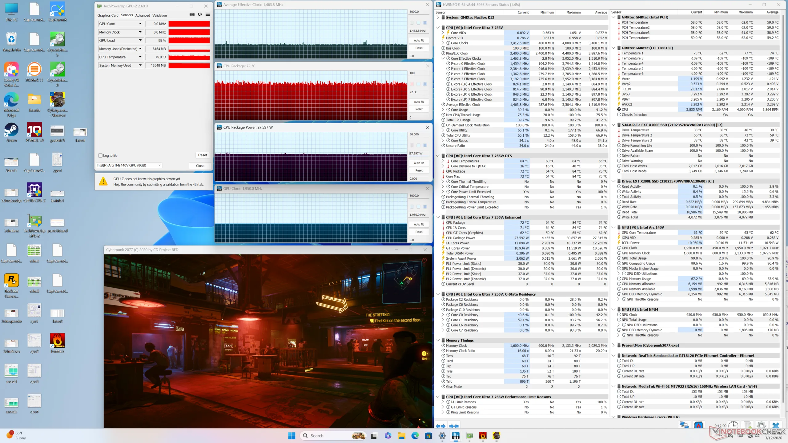 Lunar Lake-V is extremely efficient as shown by the tables below. The system consumes just 32 W on average when running Cyberpunk 2077 compared to 86 W on the NucBox K12 powered by the Radeon 780M. While the latter may be faster, it is definitely not 2x or 3x than our Intel solution.