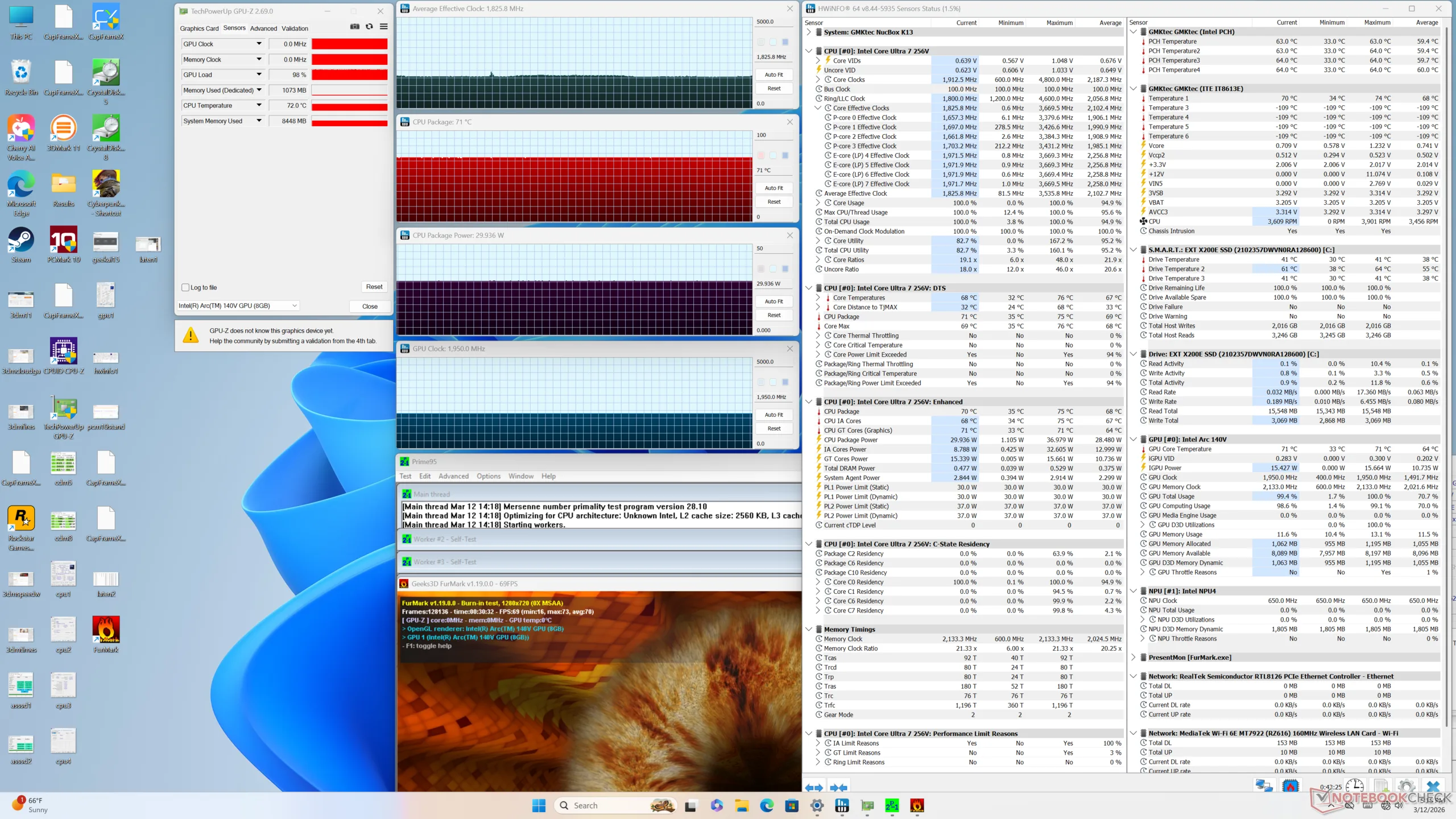| Prime95 + FurMark Stress | 1.8 | 1950 | 71 |