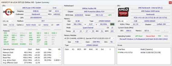 | GMK NucBox M8 AMD Ryzen 5 PRO 6650H ⎘ AMD Radeon 660M ⎘ 16 GB Memory, 512 GB SSD | Amazon: | 494 g | 63 mm | x | |