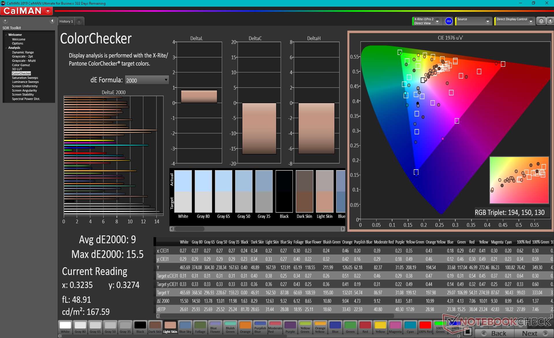 X-Rite colorimeter measurements show a very poorly calibrated display out of the box to the point where even the naked eye can notice the imbalance. Color temperature in particular is far too cool for a bluish tint. Colors and grayscale improve dramatically after calibrating the panel ourselves as shown by the CalMan screenshots below. We recommend applying our calibrated ICM profile above if possible.