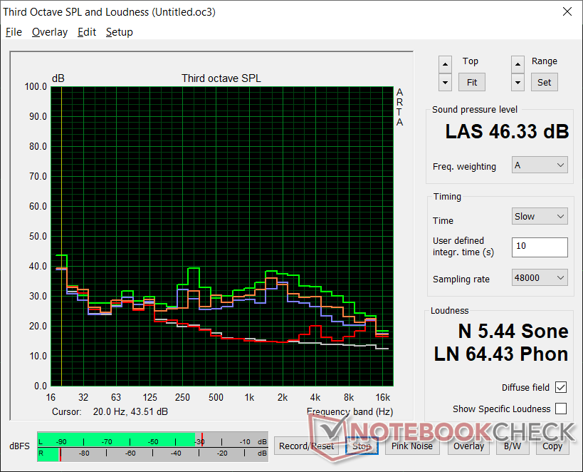 The internal fan is quiet when under low loads but will occasionally rise to 34.9 dB(A) against a background of 27.4 dB(A) if web browsing or video streaming. RPM changes are thankfully steady instead of abrupt to not be vexing.