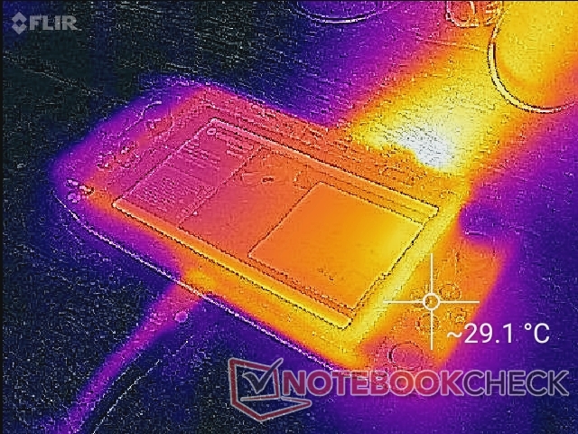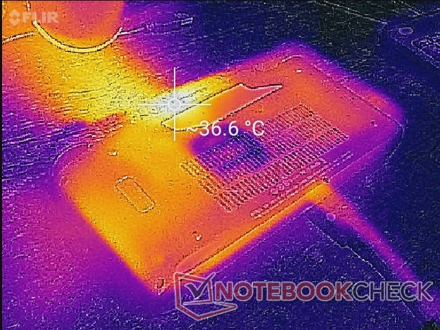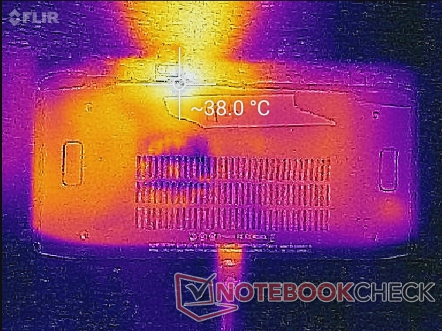 Surface temperatures are never uncomfortable. The hot spot is closest to the ventilation grilles along the top where it can reach 38 C when under load, but users won't be touching this area when gaming.