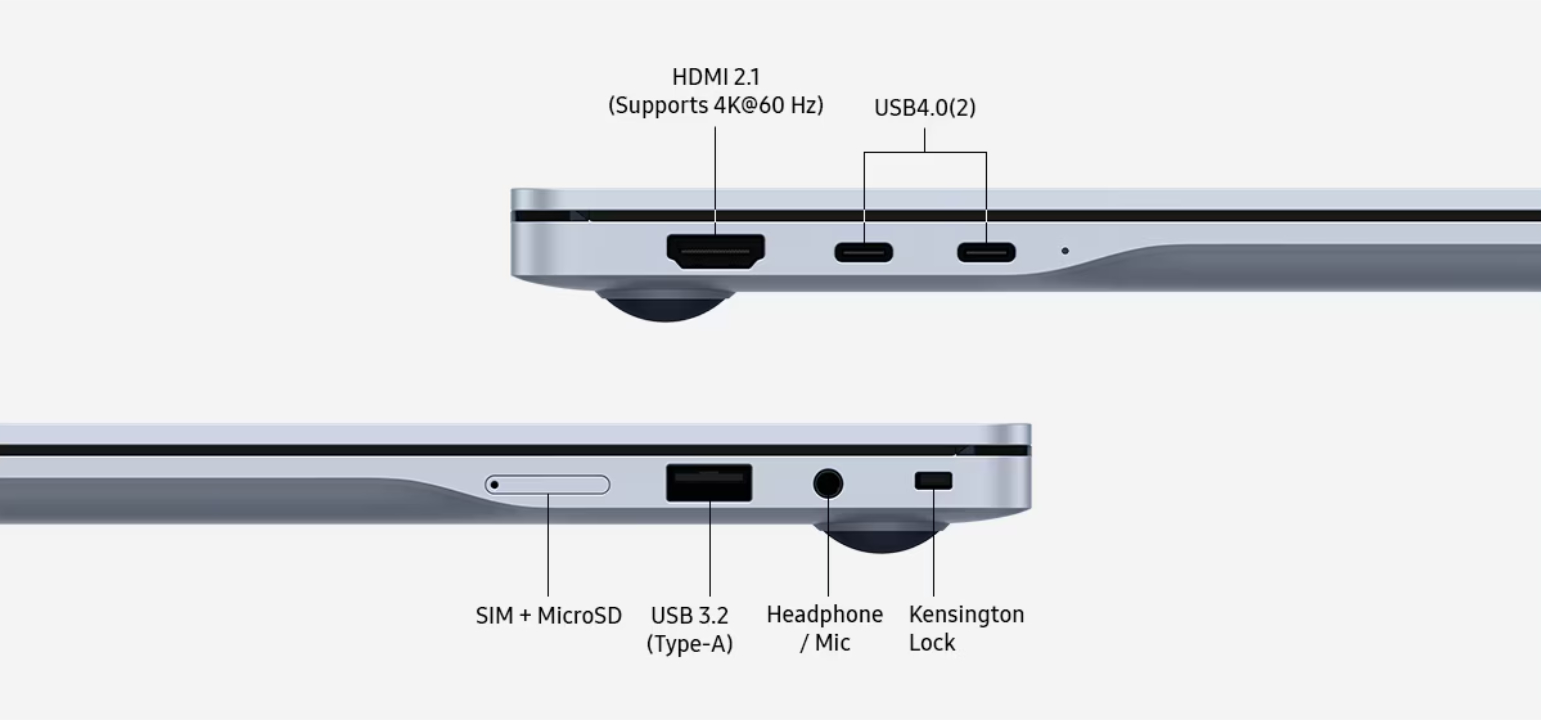 Conversely, the HDMI 2.1, USB4 and USB 3.2 Type-A ports from the Galaxy Book4 Edge return, as does a Kensington lock slot and a 3.5 mm jack on the laptop's right-hand side. The same is true of a 15.6-inch IPS display, which outputs at 1080p in a 16:9 aspect ratio with an anti-glare coating. Likewise, Samsung's newer laptop maintains an unchanged 61.2 Wh battery capacity with support for 65 W charging within roughly the same 356.6 x 229.8 x 15.5 mm dimensions as its predecessor.