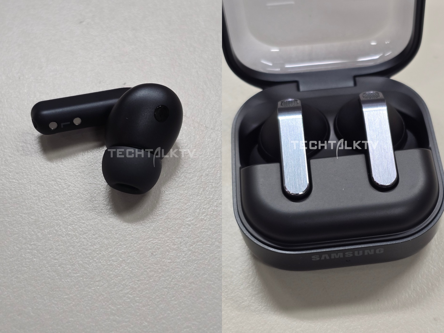 The Galaxy Buds 4 can be seen in white with a silver stem back and no earplugs. The Galaxy Buds 4 Pro can be seen in black with a silver stem, sporting the earplug design. The charging dots are on the stem since the new earbuds sit flat in the case rather than upright. The case also has a more oval button at the bottom rather than a round one, compared to the Galaxy Buds 3 series.