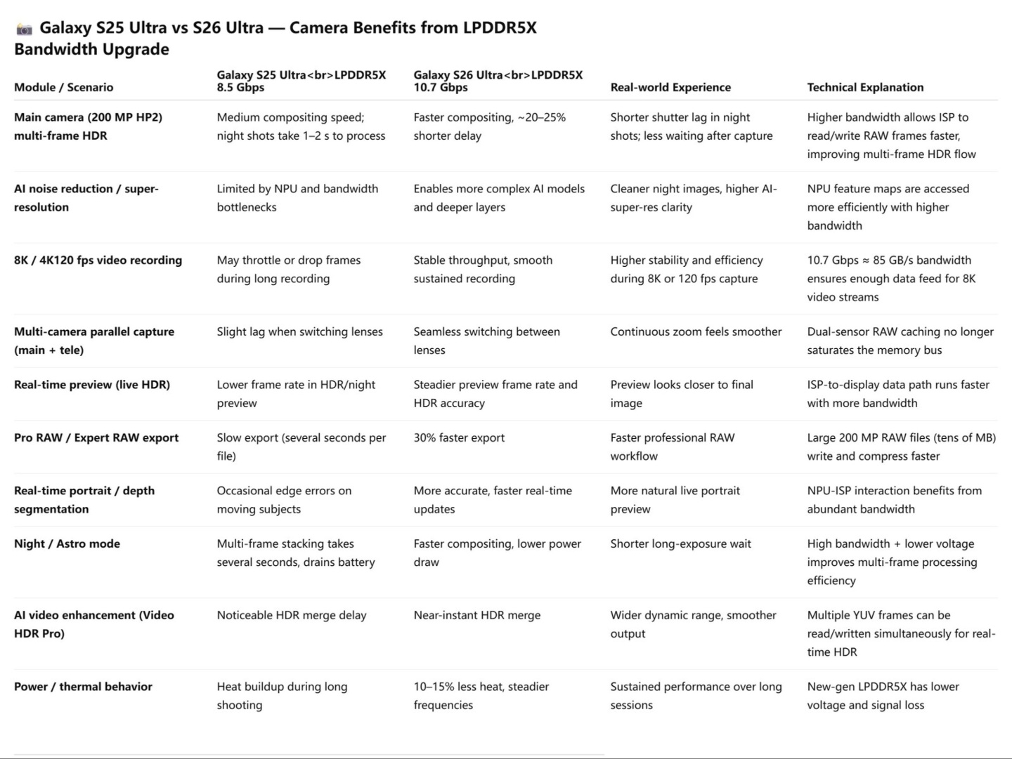 Notably, these are the same RAM configurations as the Galaxy S25 series, though there are no 128 GB storage options anymore. Looks like Samsung has decided against upgraded RAM capacity for the Galaxy S26 series. That being said, the same leaker had mentioned last week that LPDDR5X memory running at higher speeds of 10.7 Gbps, compared to 8.5 Gbps on the current generation. This will enable faster processing of night photos, less noise in low-light pictures, better dynamic range in Pro video, as well as some other camera improvements.