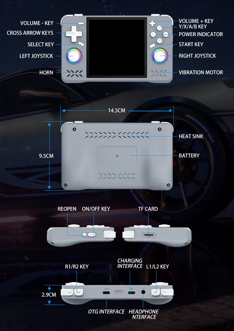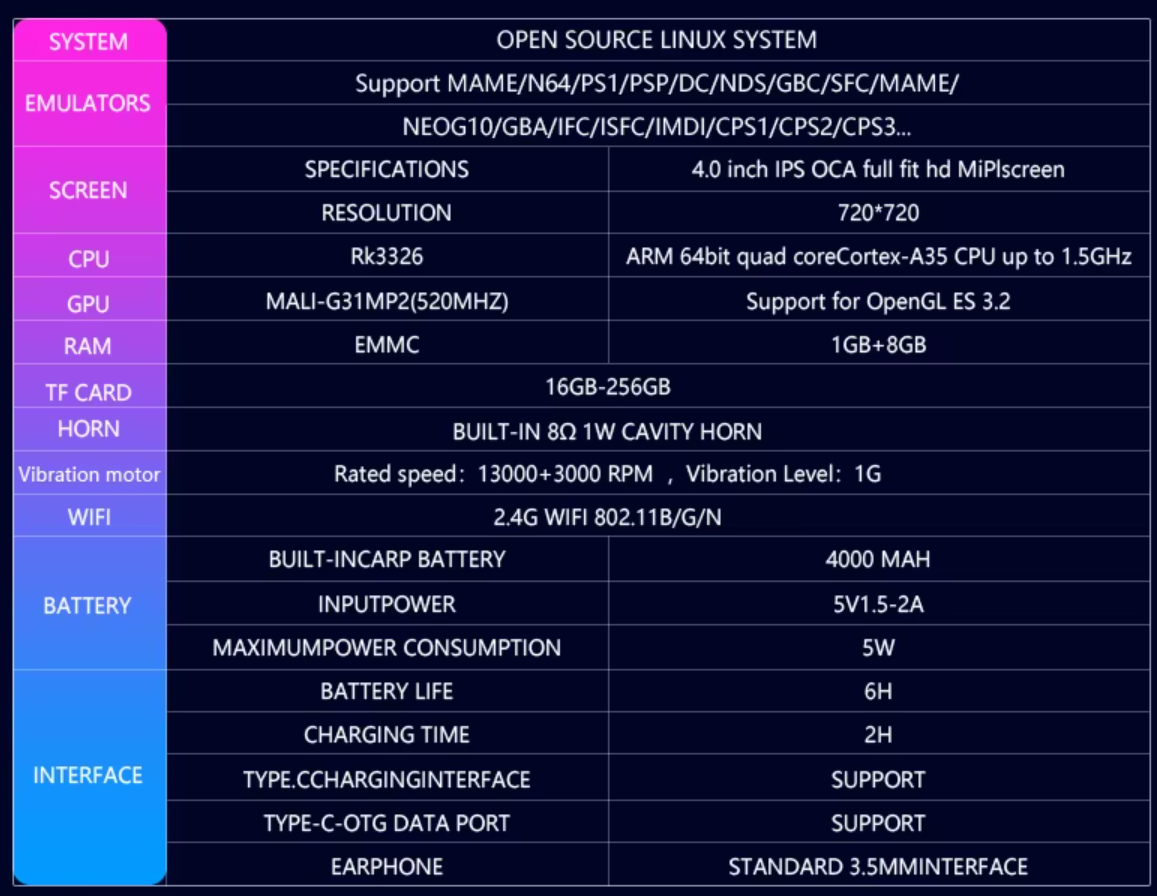 However, the latter controls are set directly above the handheld's joysticks rather than pushed slightly outwards like on the RGB30. Theoretically, this may make the XF40H less comfortable to hold than the RGB30. Regardless, the XF40H features the trusty Rockchip RK3326 chipset, as well as a 4,000 mAh battery and a 4-inch IPS display that resolves at 720 x 720 pixels.