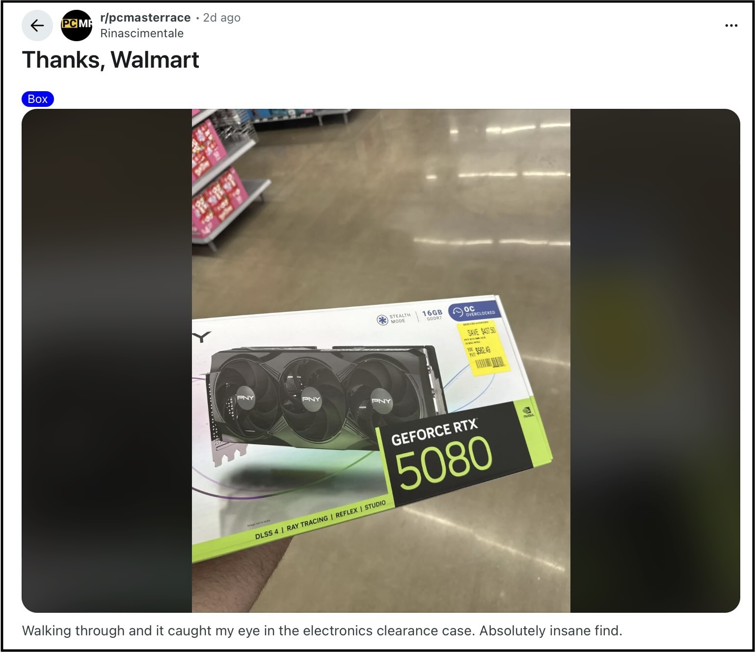 However, as we have reported on previously, a good number of enthusiasts and gamers have managed to find shockingly good deals on gaming hardware, courtesy of thrift stores and clearance sales. One such gamer has seemingly managed to pick up a PNY RTX 5080 triple-fan card for just $562 at their local Walmart, which they managed to find in the clearance aisle.