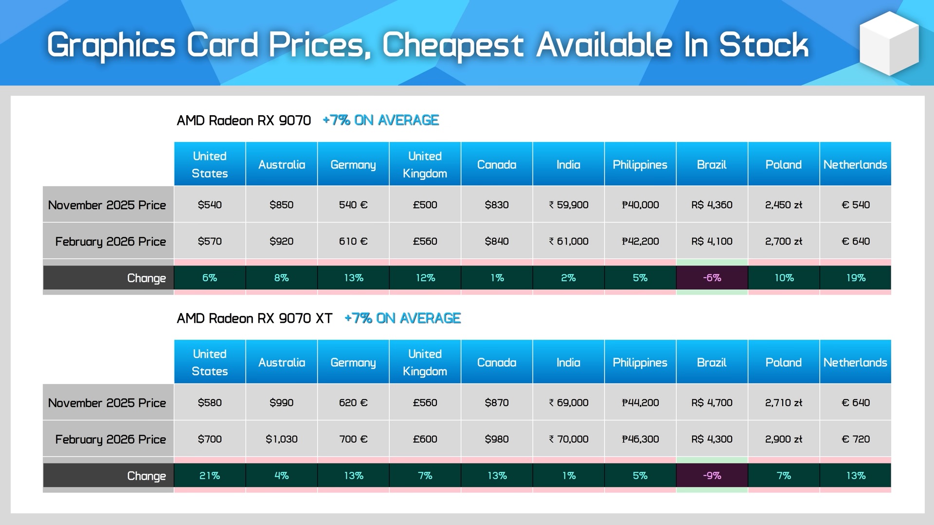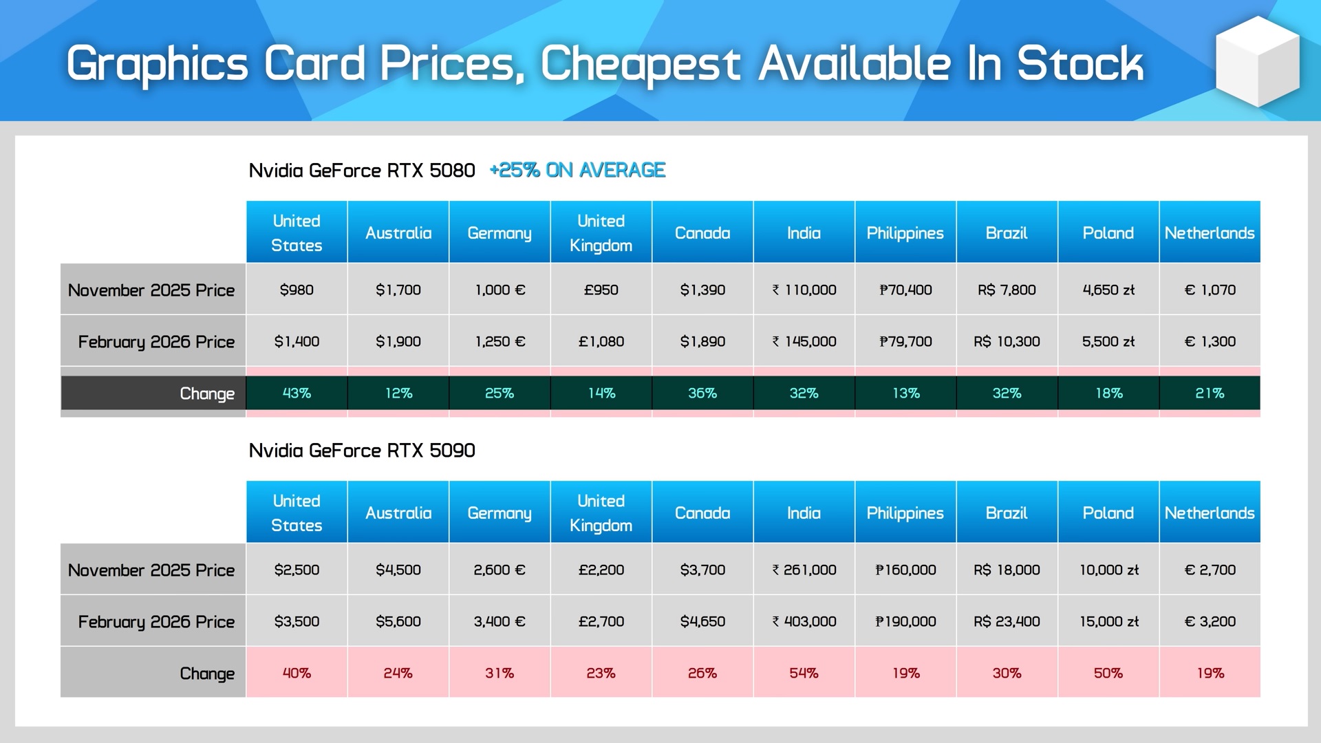The RTX 5070 Ti, which is suspected to have been severely supply-constrained, currently costs an average of 25% more in February 2026 than it did in November 2025 in the 10 regions that HU looked at. These figures stand at 25% and 32% for the RTX 5080 and the RTX 5090, respectively. The interesting thing here is that the RX 9070 XT, which directly competes with the RTX 5070 Ti, has only recorded an average price increase of 7% since November 2025 globally.