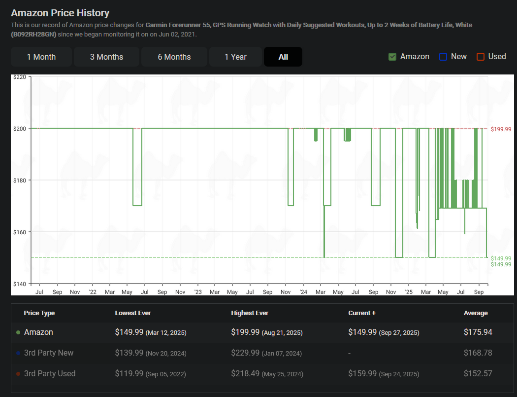Those looking for a feature-rich and affordable fitness-centred smartwatch will be pleased to know that the Garmin Forerunner 55 is now discounted on Amazon. It costs $149.99, $50 lower than its asking price of $199.99. While that isn't much, the Forerunner 55's price has never dropped below $149.99, at least on Amazon, as confirmed by CamelCamelCamel's price tracker. Even though it is four years old at this point, Garmin keeps it topped up with a steady stream of updates.