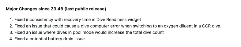 Garmin has also tackled a problem with the Descent G2’s Dive Readiness widget, where the recovery time could be inconsistent. There are fixes for issues linked to dives recorded in pool mode, increased the total dive count unexpectedly, and a dive computer error which occurred when the user switched to an oxygen diluent for a CCR dive.