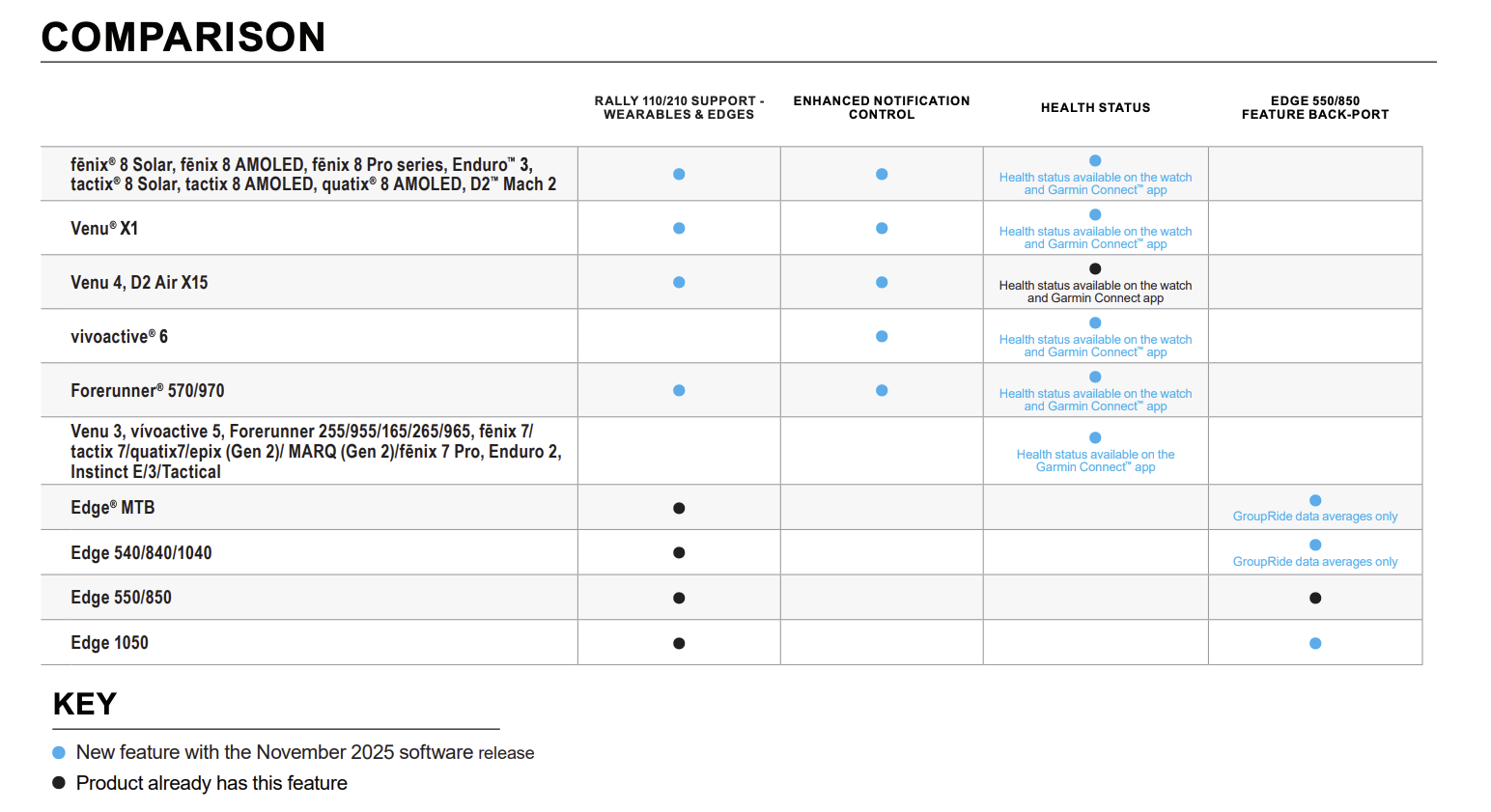As for the rest of Garmin's latest Feature Update, many are consigned to its cycling computer series like Smart Fueling and Gear Ratio analysis. With that being said, Garmin is also offering enhanced notification control across the Fenix 8, Forerunner 970, Venu 4 and Venu X1, among other associated smartwatches. Moreover, Garmin has added Rally 110 and Rally 210 support for numerous wearables too, with the November 2025 Feature Update as the image above shows.