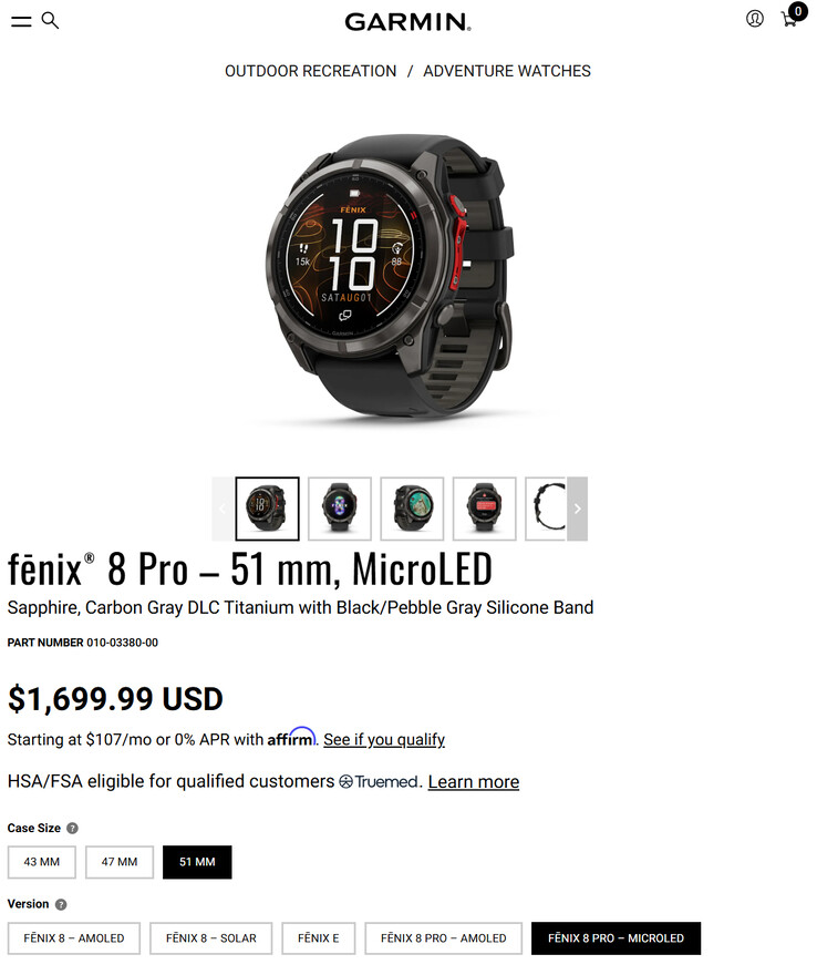 Initially, an $800 gap existed between 51 mm versions of the Fenix 8 Pro with AMOLED and MicroLED displays. As a result, the only way of optioning Garmin's new ultra-bright display technology was to spend $1,999.99.