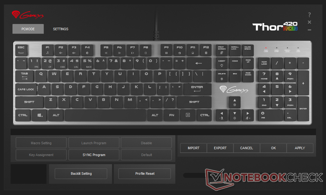 Additionally, the Thor 420 RGB comes with 19 backlight modes programmed into the keyboard itself. These can be toggled in software, but a nice feature is that there are hotkeys for cycling both RGB modes and colors on the keyboard. Because of this, the Thor 420 RGB is essentially plug-and-play, which is nice. The software is available if you want it, but the keyboard does not rely on it. The Thor 420 RGB also doesn't automatically install a software suite, which gives the users the choice as to whether or not they want to use Genesis' software (more on that below).