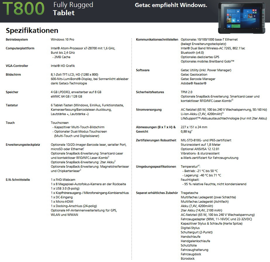 The system comes with Windows 10 Pro pre-installed and will carry a starting retail price of around 1360 Euros. Of course, users who wish to configure additional features will see higher prices. Optional extras include either a 1D or 2D barcode scanner and a RS232 port. There is also a MicroSD slot and an Ethernet LAN module. A special SnapBack docking solution on the back of the tablet allows owners to attach even more features including a SmartCard reader, contact-less RFID/NFC readers, or a secondary battery for longer runtimes. More details and information on the Getac T800 can be found on the specifications below.