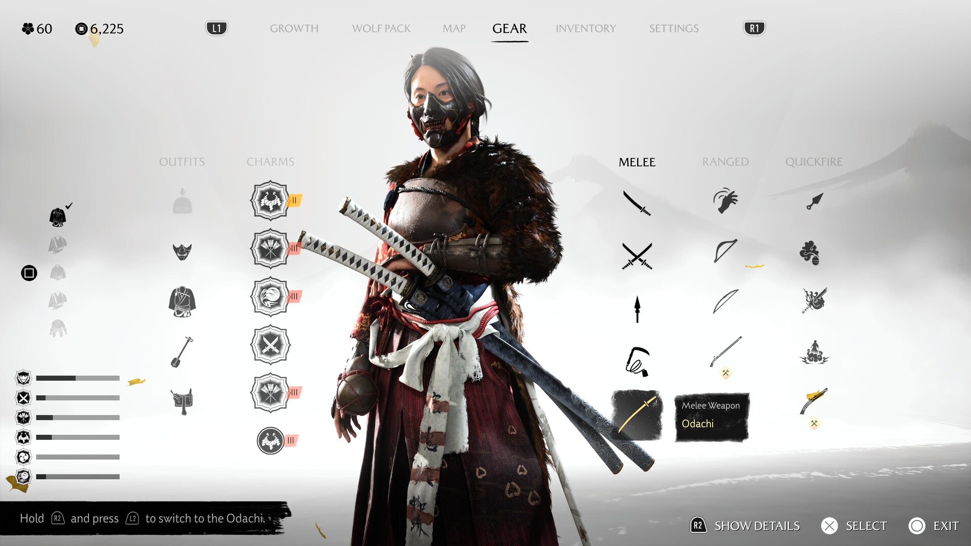 One of the most notable changes in Ghost of Yotei is weapon variety, a much-needed step-up from Tsushima’s stance-based combat. Balancing multiple weapons can be tricky, but nothing in the game seems overtly overpowered. Weapon switching is seamless and a necessary mechanic because enemies often carry an entire arsenal and some weapons are hard counters to others, for example, Yari wielders are countered by dual-Katanas, brutes by the Odachi and so on. The actual combat is fairly challenging, even at regular difficulty. Multiple enemies swarm at you and keeping a track of each one gets daunting. By default, the ability to lock-on to individual foes is disabled, and I’d highly recommend enabling it via the settings. Multiple aspects of difficulty, such as damage taken, enemy detection speed and enemy aggression, is customizable on a per-item basis. Think of it as a watered-down version of what Doom: The Dark Ages offers. Parries are easy to master with a little practice. To get the timing baked into your muscle memory, play with the Bounty Hunter armour that disables regular deflects altogether but relaxes the parry timings. Ranged combat gets a breath of fresh air with the inclusion of throwable bombs and a gun, for some reason. I wasn’t too fond of it, but your mileage may vary. One side-quest gives you charm that lets automatically headshot enemies with zero effort for that clip-worthy 360-no-scope.