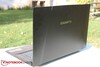 The display reacts very sensitively when it comes to twisting and pressure on the display lid. The display lid is emblazoned with the silver Gigabyte logo. The top of the lid is not flat—instead it sports an indentation of sorts as a design feature. The display itself has a relatively wide bezel. The camera and microphone are located along the top, while another Gigabyte logo adorns the bottom part of the frame.