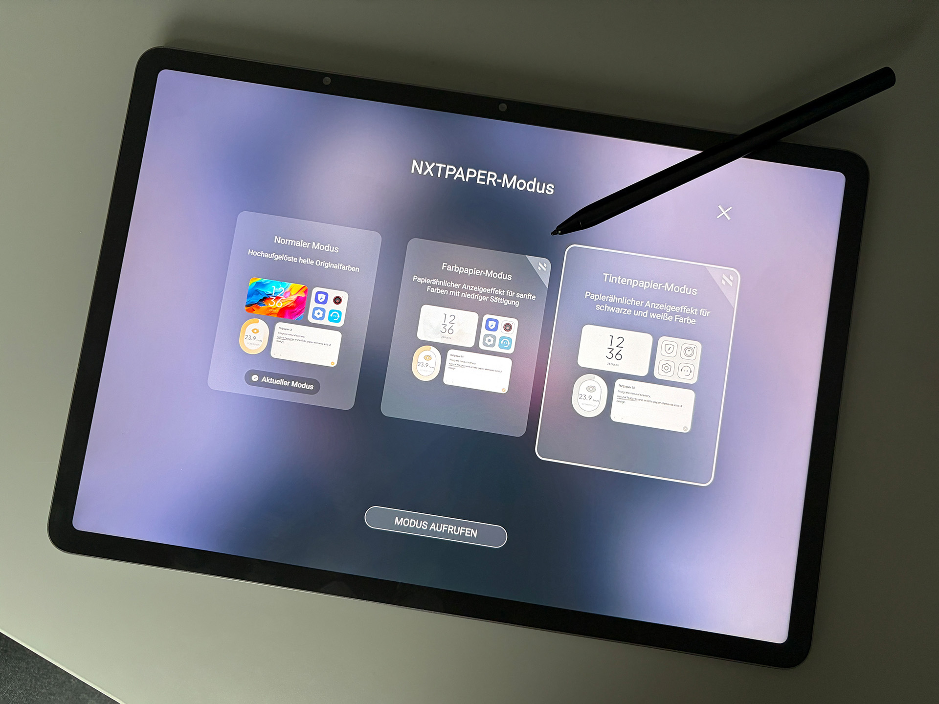 The display mode can be changed using a dedicated button. In addition to the standard mode, there is a Color Paper mode that is designed to simulate colored paper, resulting in a much warmer image with lower saturation and softer colors. The third mode is called Ink Paper mode and is limited to monochrome output, similar to an e-book reader. However, there is no real E Ink display, and we would have liked to see better calibration for color reproduction as well.