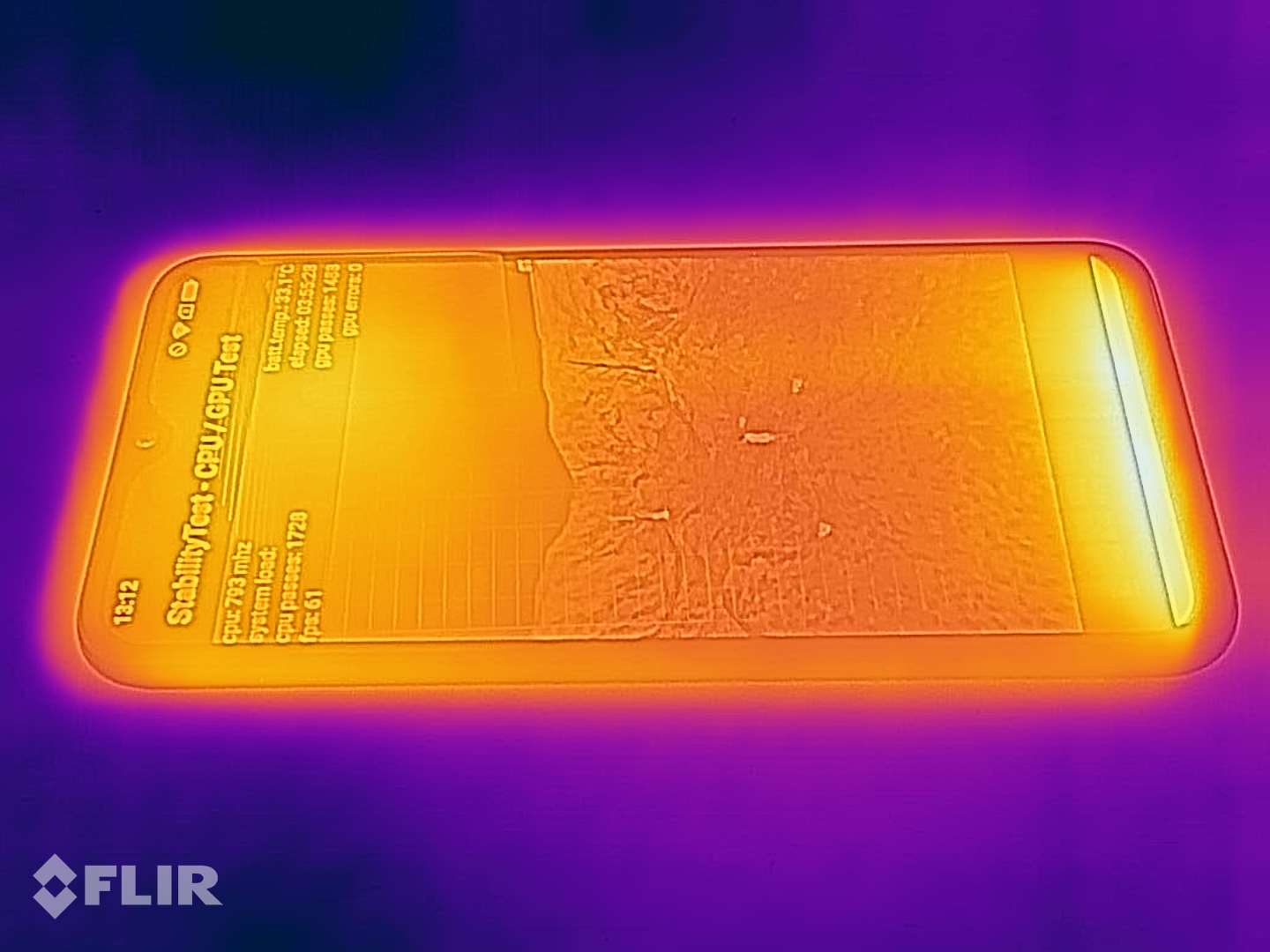 (+) In idle usage, the average temperature for the upper side is 27.5 °C / 82 F, compared to the device average of 32.9 °C / 91 F.
