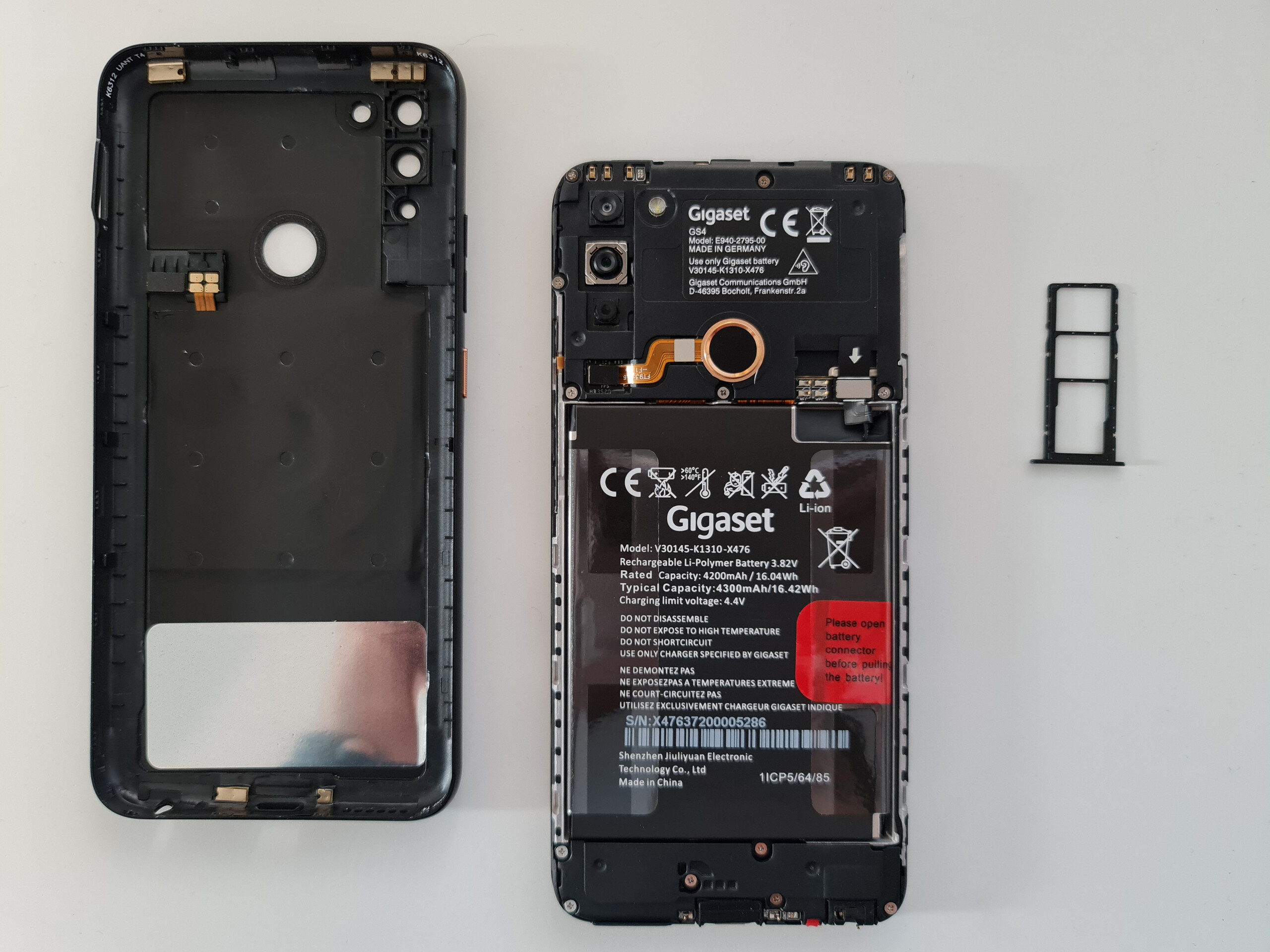 The 4,300 mAh strong battery enables really good battery runtimes for the Gigaset GS4. Although only a 10-watt charger is included, fast charging with up to 18 watts is supported and even wireless charging with up to 15 watts is possible