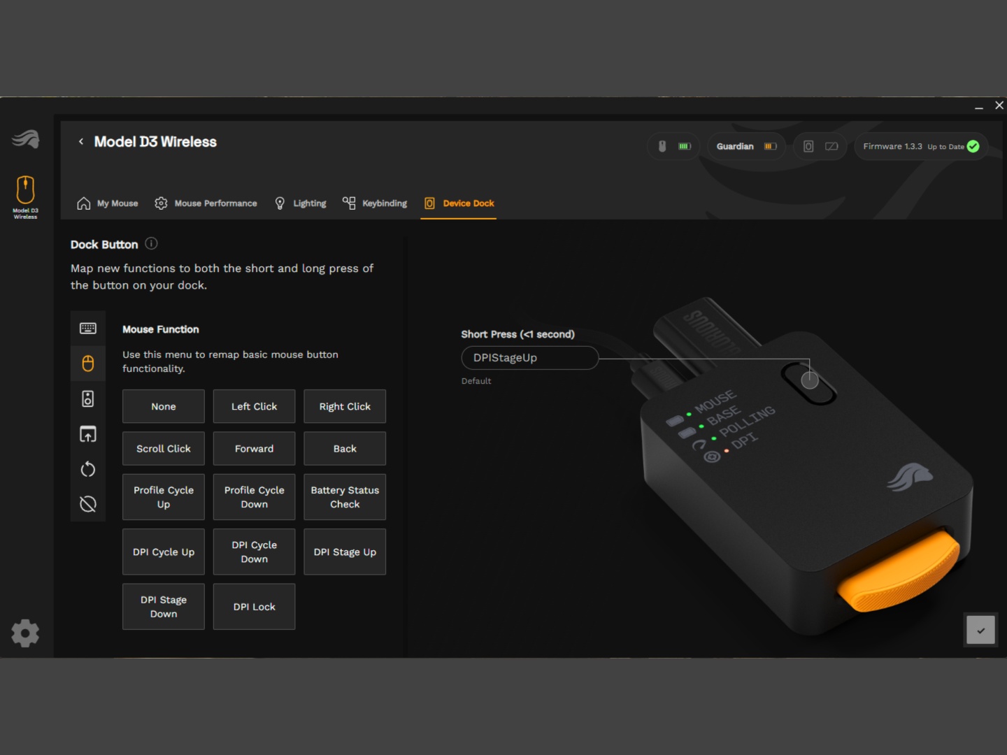 The base acts as a connectivity and charging station. Not only does it house the 2.4 GHz dongle, it has a slot for charging the spare battery. There are also four LED indicators for monitoring battery levels of the mouse, the spare battery, as well as the polling rate and DPI. Glorious has added a button on the base as well that can be customized through the Core software. It can be used to launch apps or execute macros, which is pretty cool.
